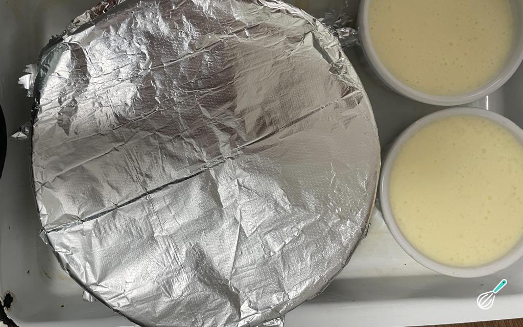 Cubra com papel alumínio, coloque a forma de pudim numa forma maior e adicione água quente para fazer o banho-maria. Leve para o forno preaquecido a 160 graus por 1h20 ou até o centro do pudim ficar firme.