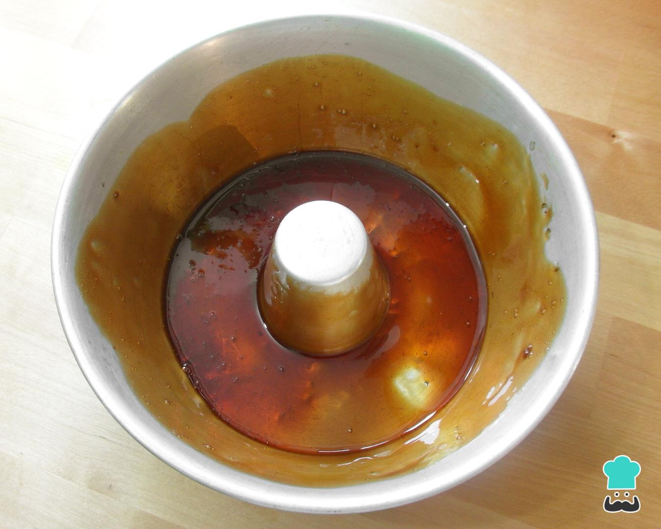 Por fim, prepare a calda de caramelo: misture o açúcar e a água numa panela e leve ao fogo médio-baixo. Deixe sem mexer, por uns 5 minutos, ou até a calda ficar espessa e em tom âmbar.