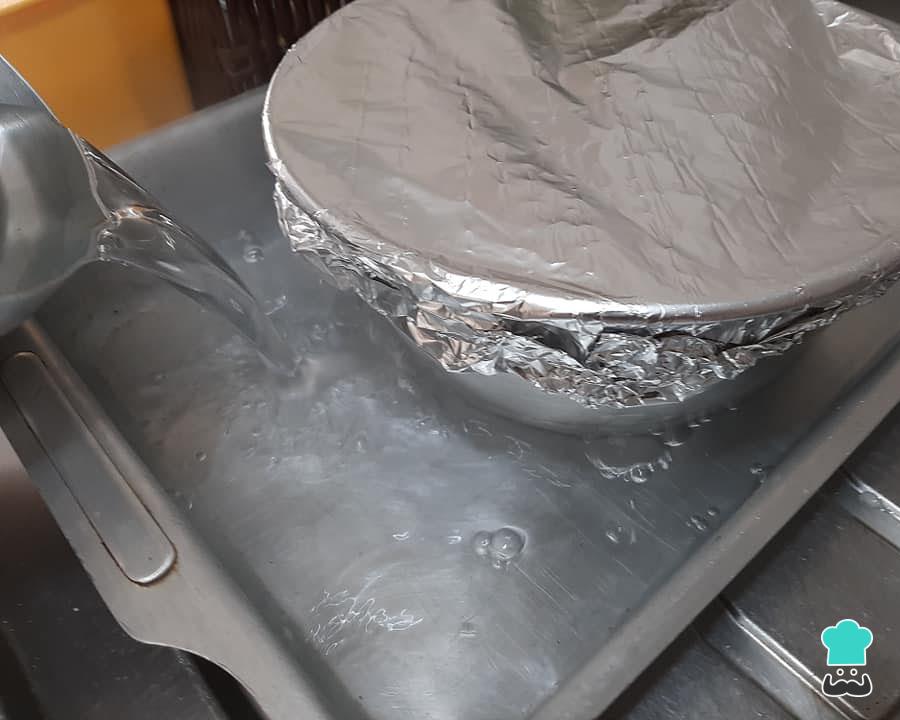 Coloque assando em banho-maria no forno preaquecido nos 180ºC por 1 hora a 1 hora e meia - faça o teste do palito após 1 hora, para comprovar a consistência desta sobremesa. Depois desse tempo retire a forma do forno e do tabuleiro de banho-maria e deixe esfriar, sem desenformar.
