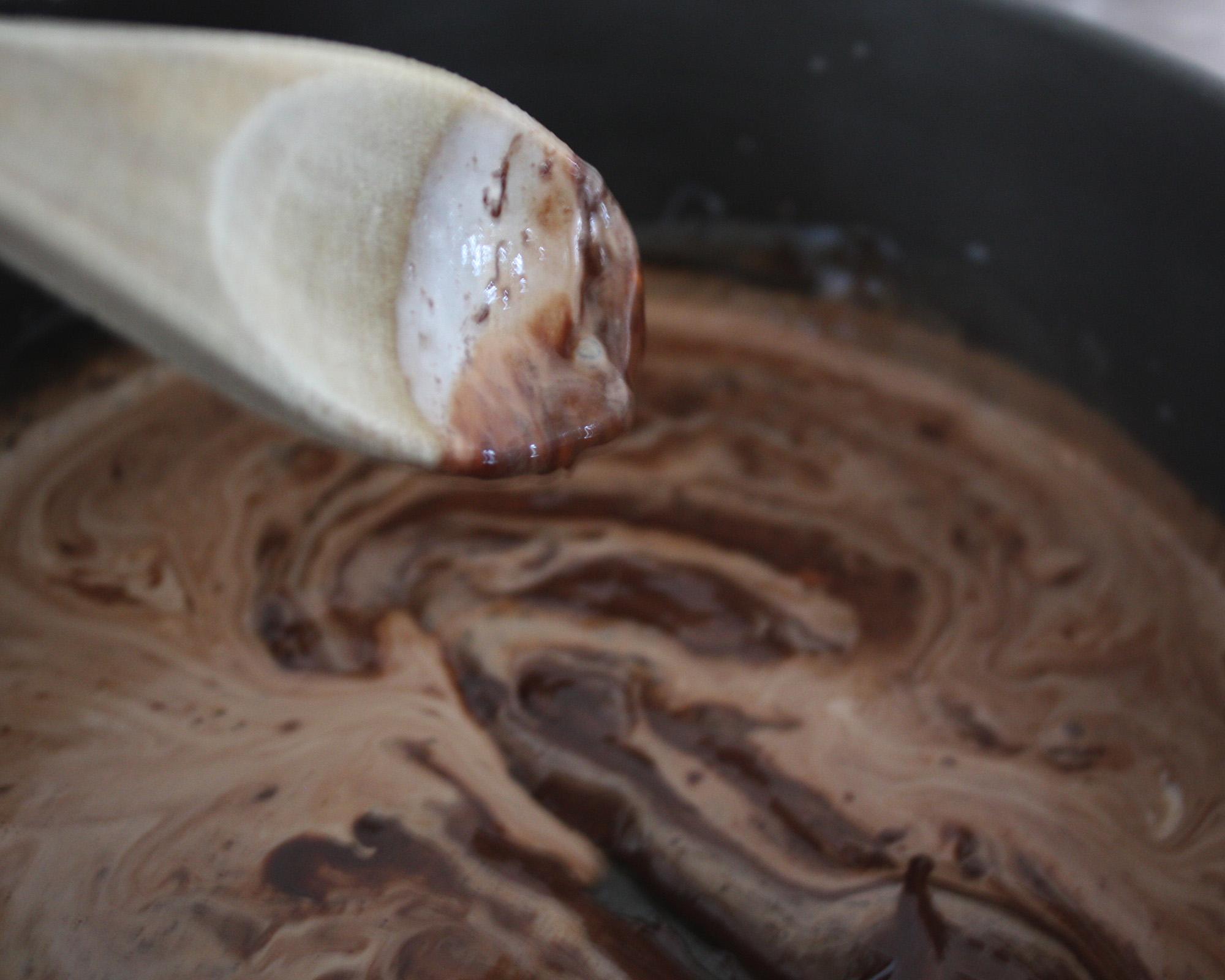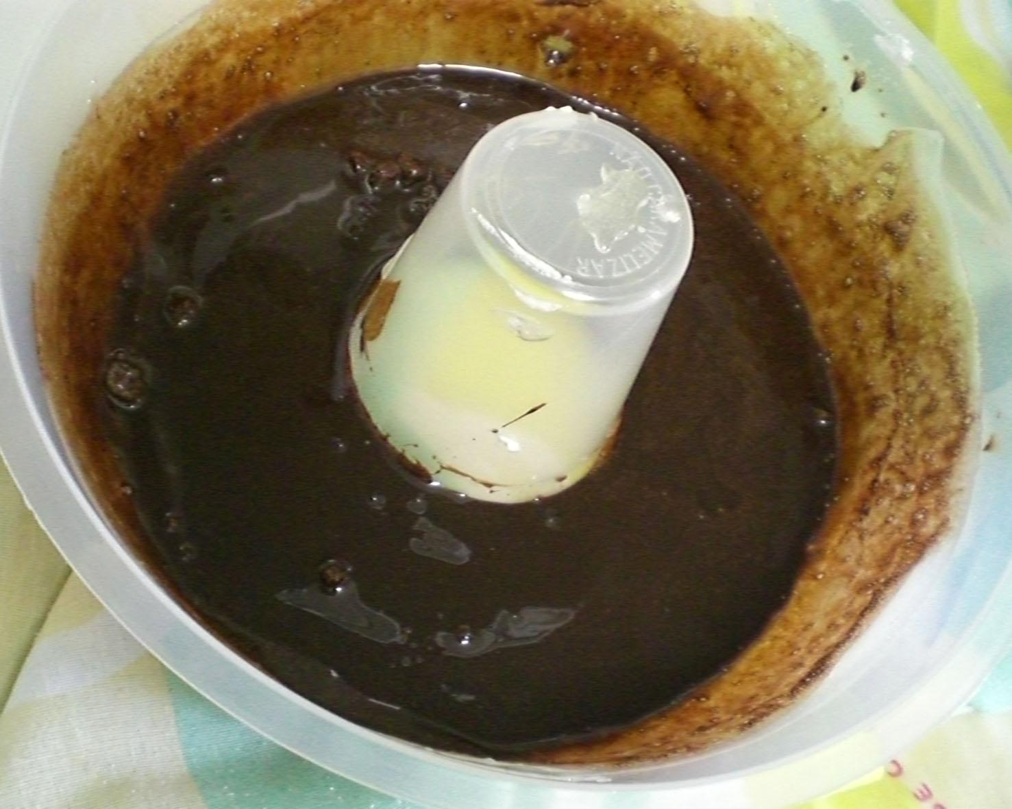 Desligue o fogo e espalhe a calda de chocolate em uma forma de pudim. Reserve para esfriar e continue preparando este pudim gelado.