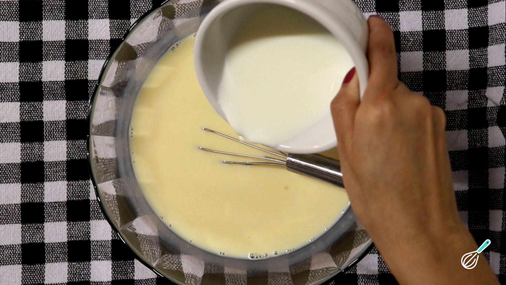 Acrescente o leite integral aos poucos, mexendo delicadamente com o batedor. Deixe a massa do pudim descansando enquanto prepara o caramelo - tanto a mistura delicada quanto esse descanso ajudarão a garantir um pudim sem furinhos.