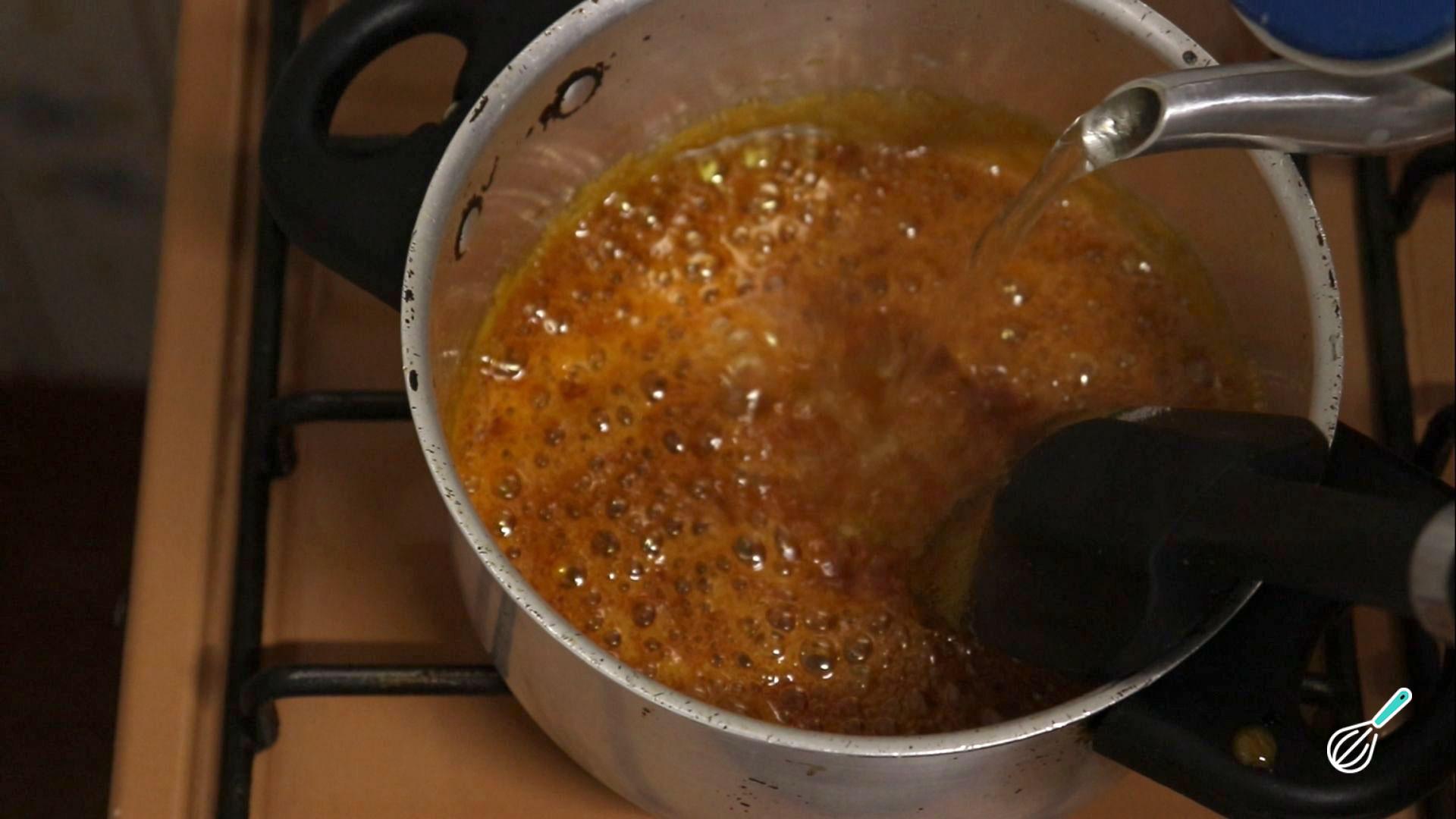 Coloque 40 ml da água fervente sobre o caramelo - muito cuidado porque a calda vai borbulhar. Seja rápido nesta etapa e misture com uma espátula até que o caramelo fique liso.
