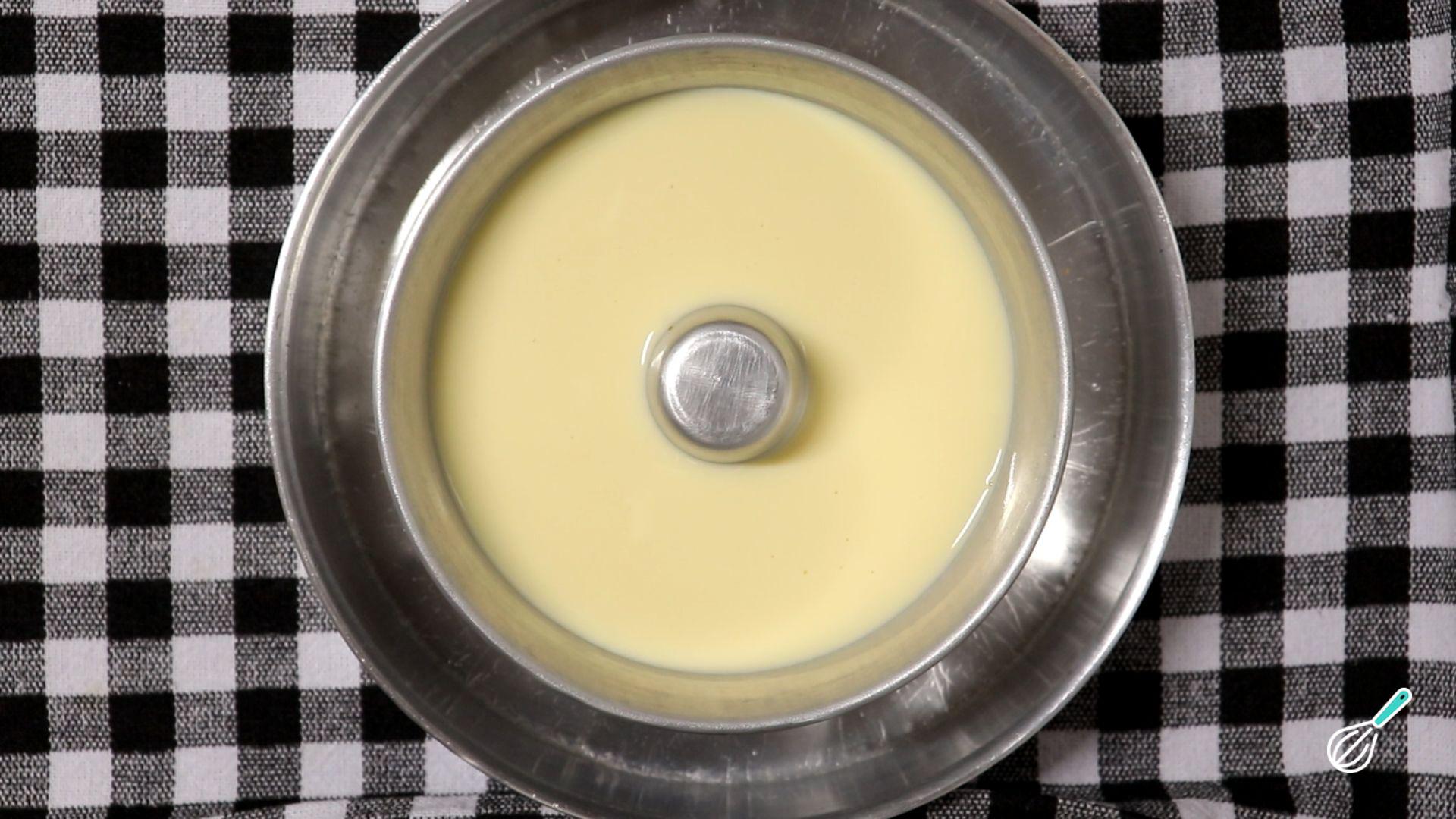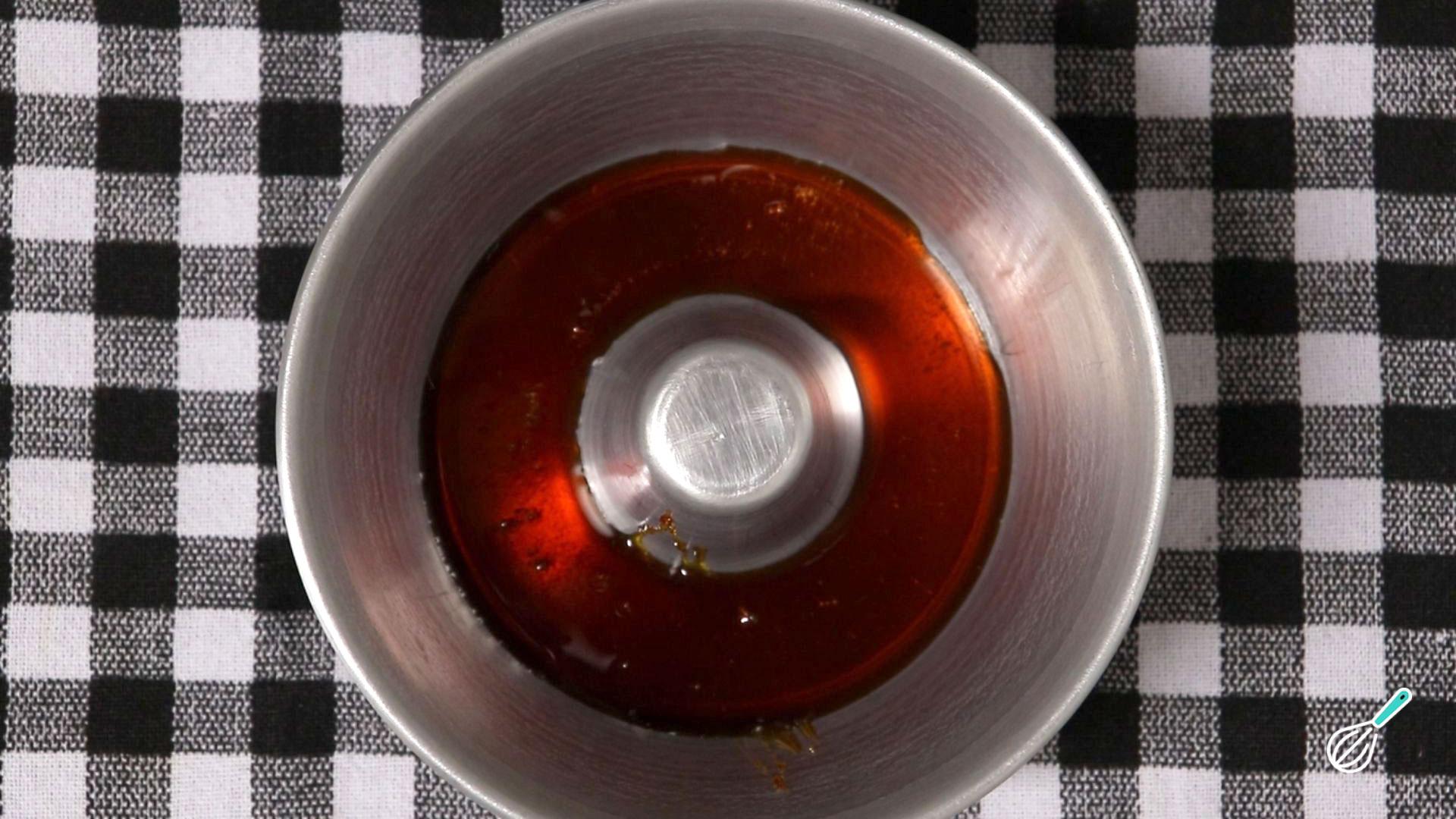 Coloque a calda na sua forma de pudim (a nossa mede 14 cm de diâmetro) e espalhe bem no fundo e laterais.