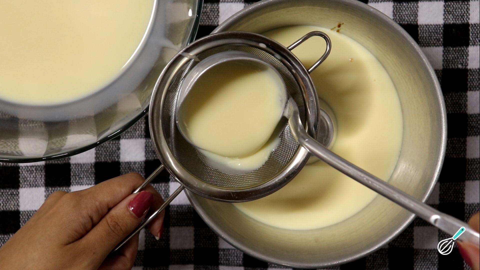 Usando uma peneira despeje a massa do pudim na forma, como na foto - essa é mais uma dica para deixar o seu pudim sem furinhos.