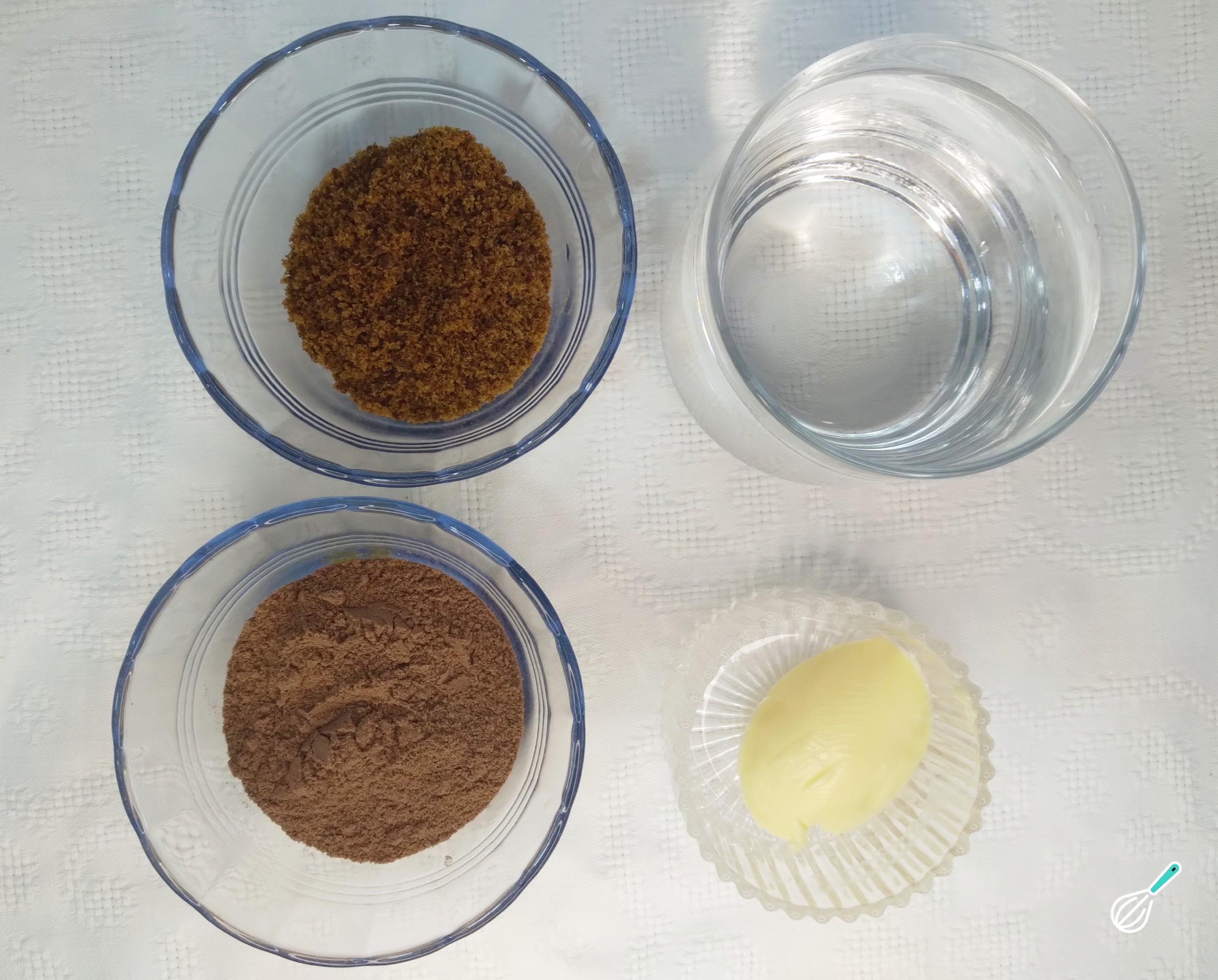 Depois de gelar o pudim, prepare a calda. Separe todos os ingredientes. O chocolate em pó, pode ser substituído por cacau em pó.