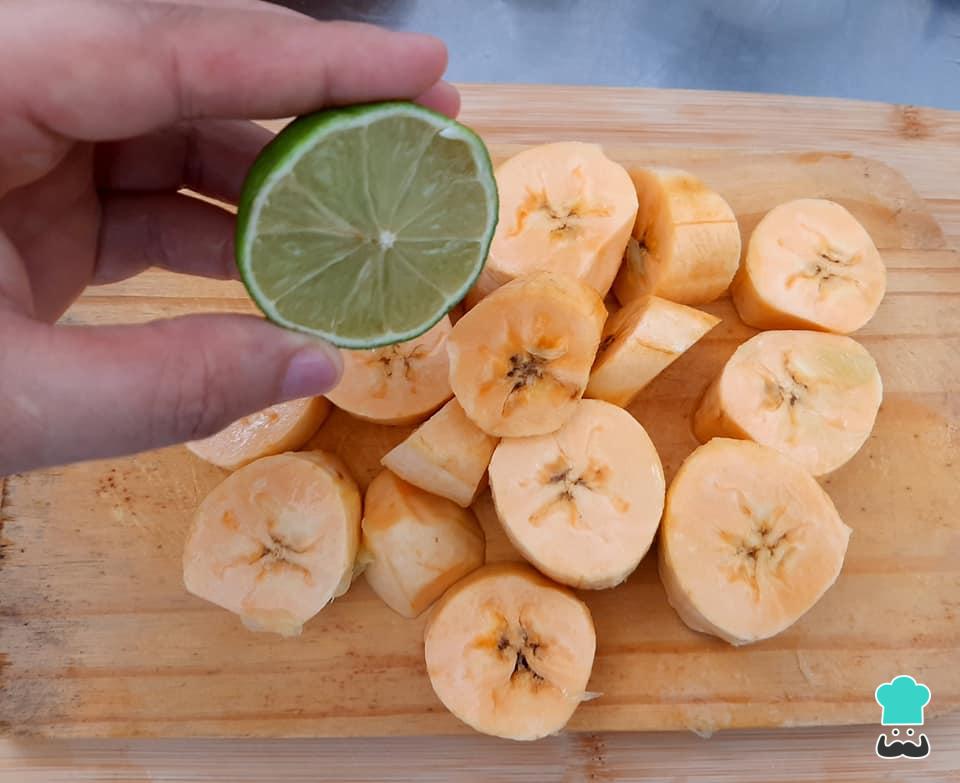 Descasque as bananas da terra, corte-a em rodelas médias e pingue gotas de limão sobre elas. Reserve.