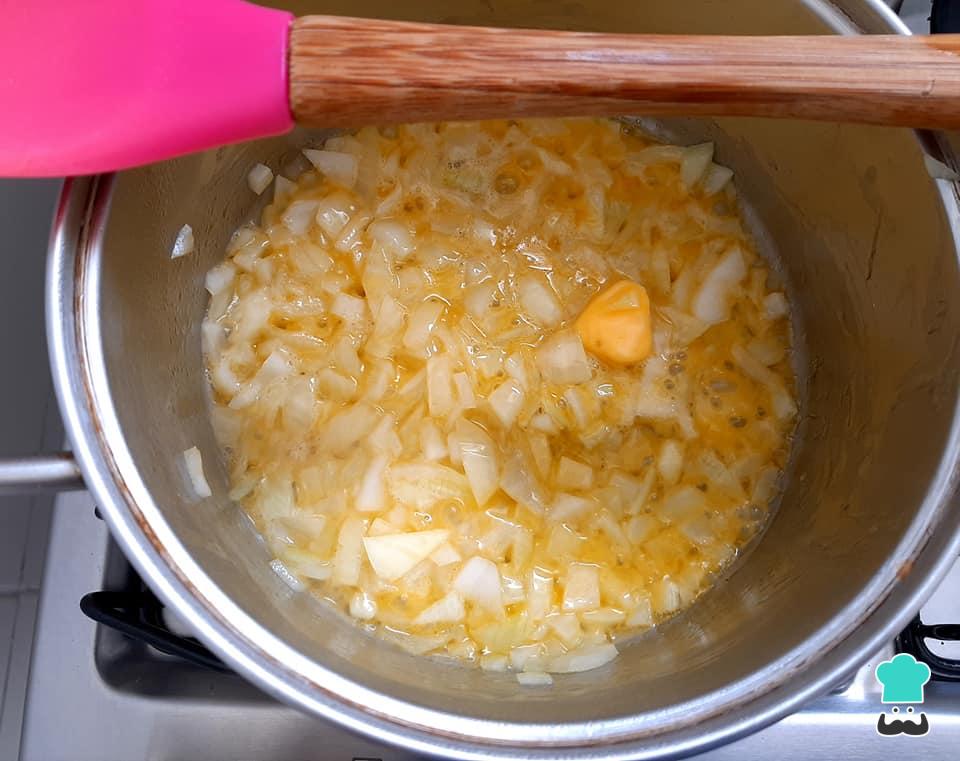 Numa panela média, aqueça a manteiga e acrescente a cebola picada, refogando até que a cebola murche um pouco.
