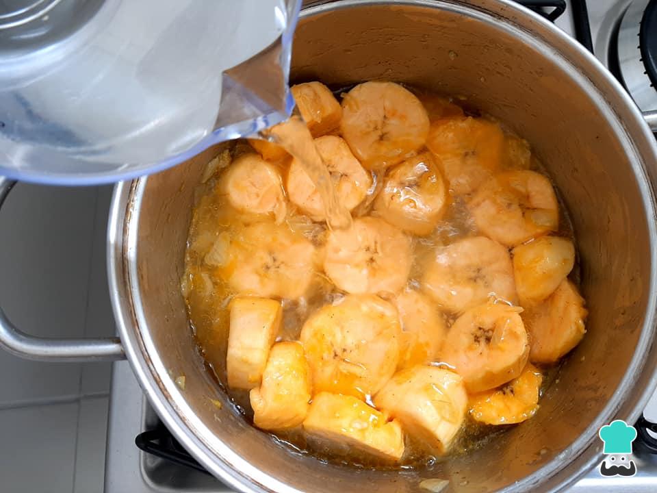 Acrescente as rodelas de banana da terra, tempere com sal e pimenta do reino e preencha com a água reservada, cobrindo parcialmente as bananas.