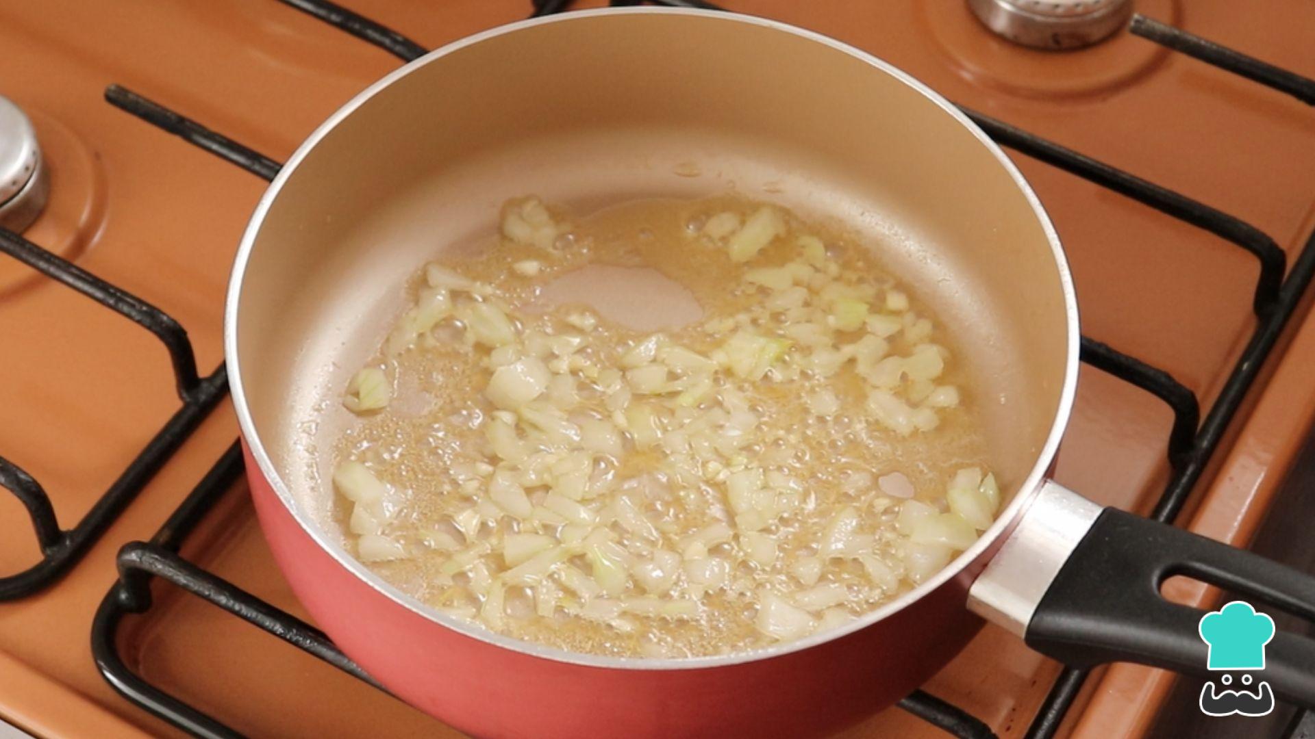 Leve uma panela ao fogo médio, adicione a manteiga e refogue o alho e a cebola.