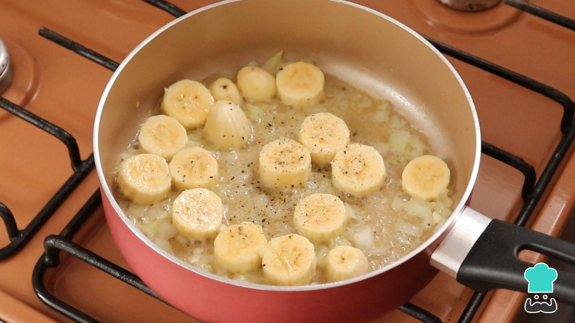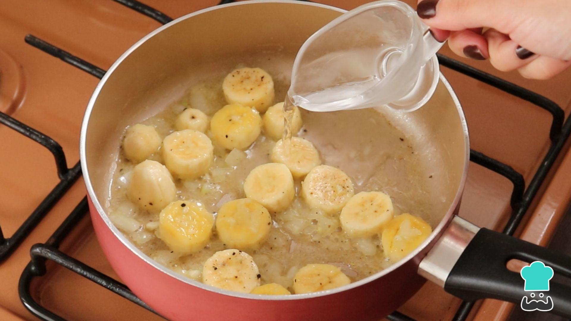 Despeje a água aos poucos e cozinhe até as bananas ficarem macias.