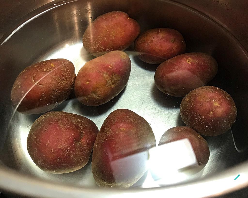 Primeiríssimo de tudo: limpe muito bem as batatas e coloque para cozinhar. Encha uma panela com água fria, coloque as batatas dentro e leve ao fogo. Cozinhe por mais ou menos 20 minutos, até você enfiar um garfo e ele não sentir resistência para furar a batata.