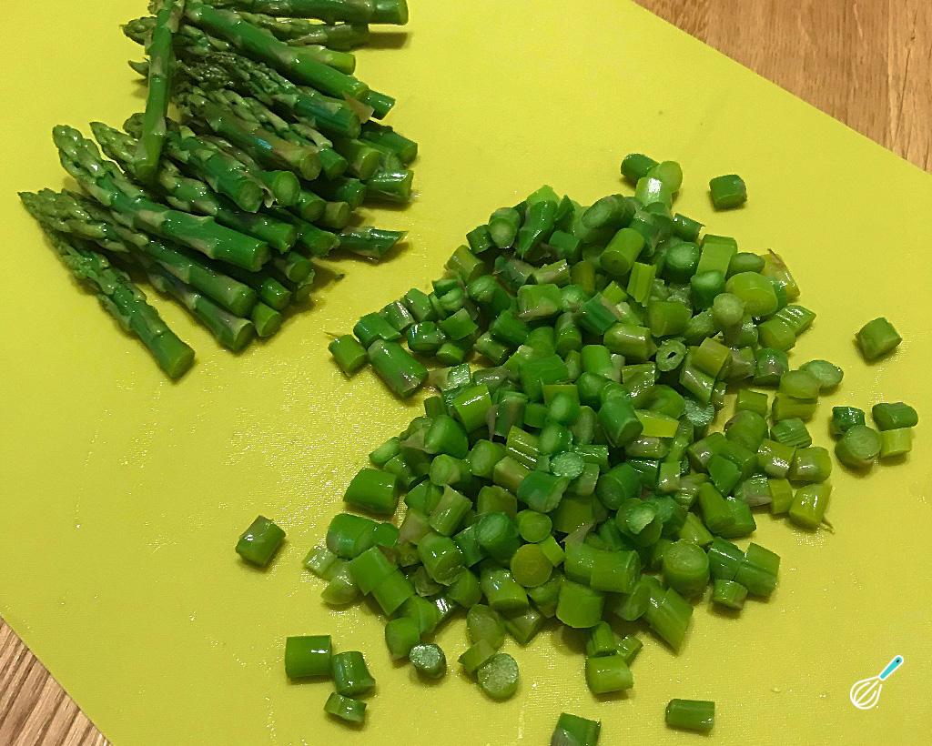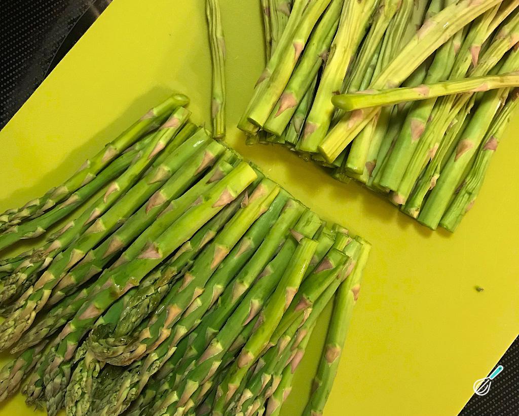 Enquanto as batatas cozinham, corte os aspargos. Primeiramente corte a parte mais fibrosa do bichinho, mais ou menos na metade dele, como na foto.