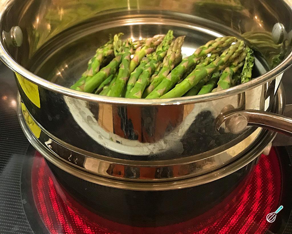 Cozinhe as pontas de aspargo no vapor, mais ou menos 5 minutos - depende da grossura do seu aspargo. No final o aspargo deve ficar com cara de cozinhado, mas ainda durinho.