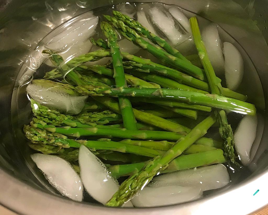 Assim que terminar de cozinhar os aspargos no vapor, mergulhe-os numa vasilha com água com gelo - isso vai fazer o cozimento parar (ele vai se manter crocante) e ainda vão ficar com um verde mais vibrante, mais apetitosos!