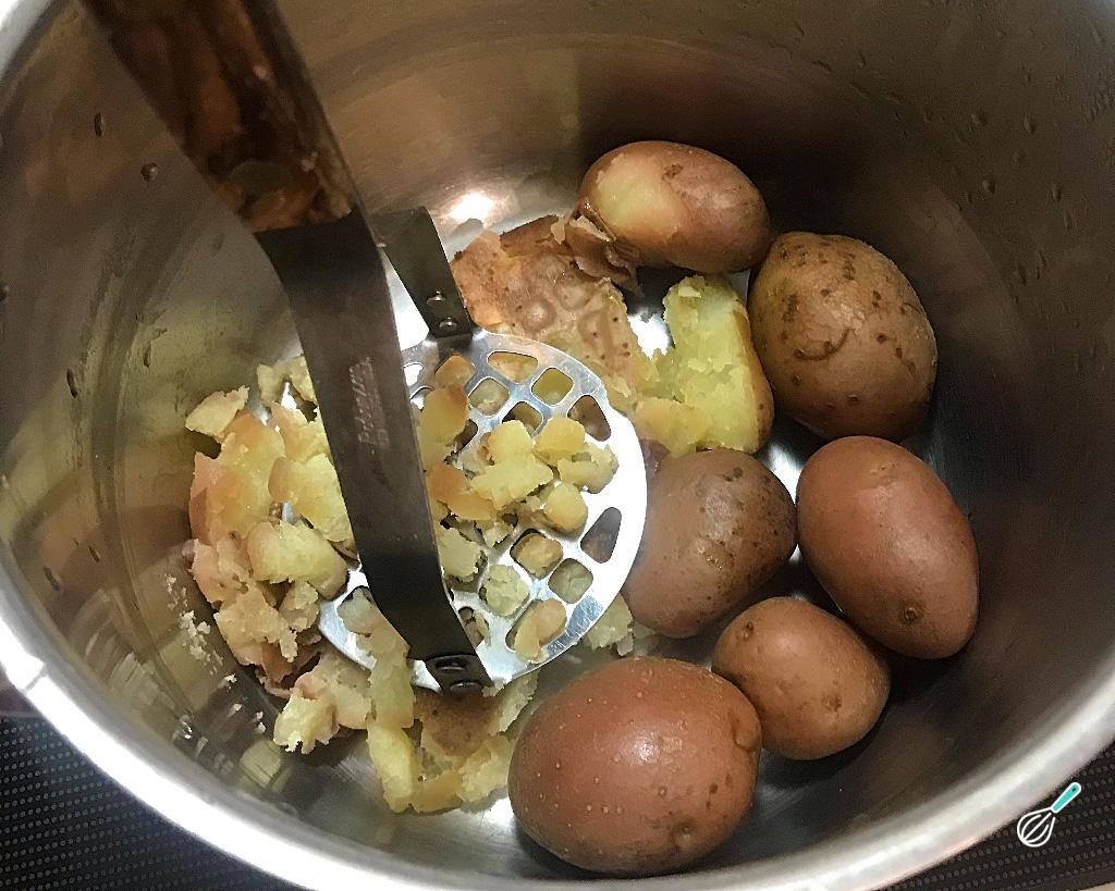 Drene as batatas e salve uma xícara da água do cozimento. Volte com as batatas para a mesma panela, deixe em fogo médio e vá mexendo as batatas, para elas secarem um pouco. Depois amasse com a ajuda de um amassador, como o da foto, ou então com um garfo.