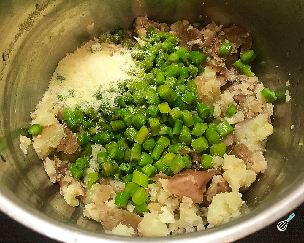 Acrescente nas batatas o azeite, o queijo ralado, o sal, a pimenta e os talinhos de aspargos. Mexa bem e, se achar que está muito seco, vá adicionando a água do cozimento que você separou, até ficar na textura desejada.