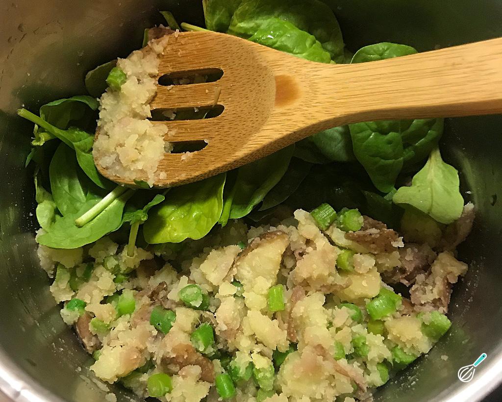 Por último adicione as folhas do espinafre e mexa até elas murcharem - não precisa cozinhar o espinafre antes, as folhas vão cozinhar o suficiente com o calor das batatas e da panela.