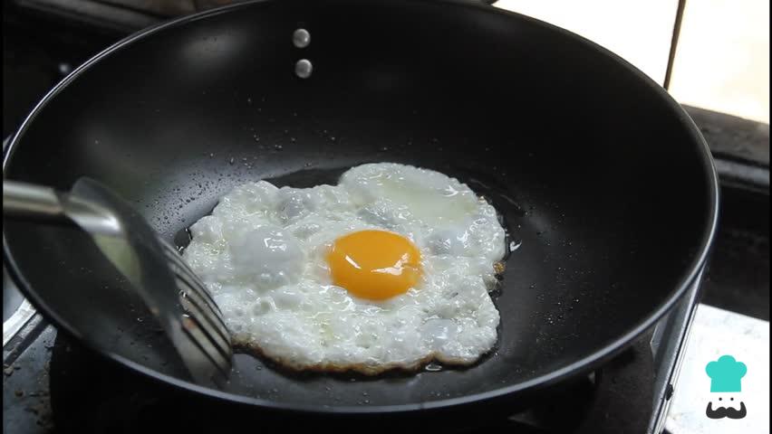 Esquente um pouco de azeite em uma frigideira para fritar os ovos. Frite um de cada vez até ficarem bem fritos e remova os ovos com uma escumadeira.