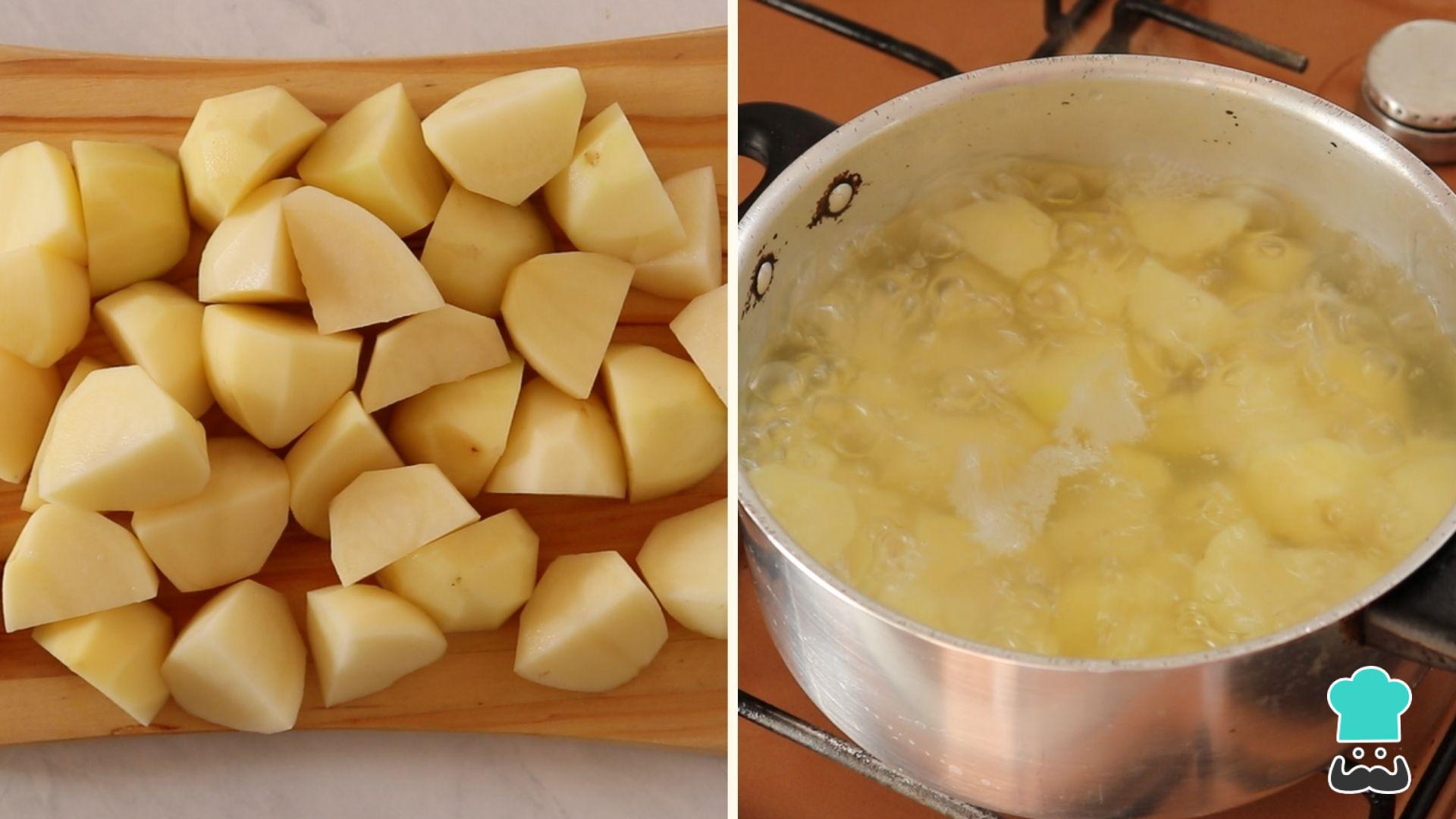 Lave, descasque e corte as batatas em pedaços menores. Coloque em uma panela, cubra com água, adicione 1 colher de chá de sal e cozinhe até todos os pedaços ficarem macios.