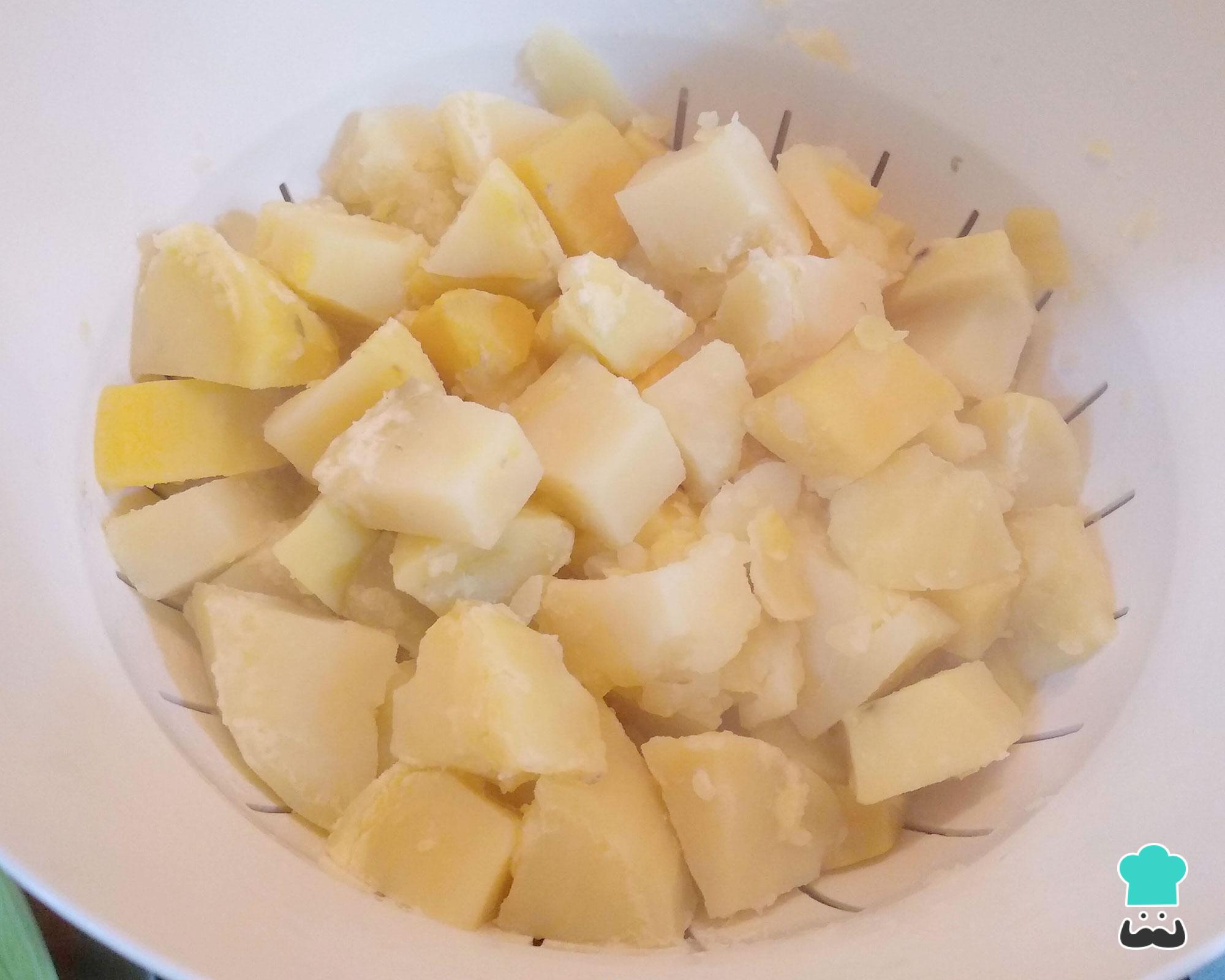 Primeiramente descasque as batatas, corte em cubinhos e leve para cozinhar numa panela com água e o sal até ficarem bem macias (15 a 20 minutos após ferver). Depois escorra e reserve por 5 minutos, para as batatas esfriarem um pouco e ficar menos úmidas.