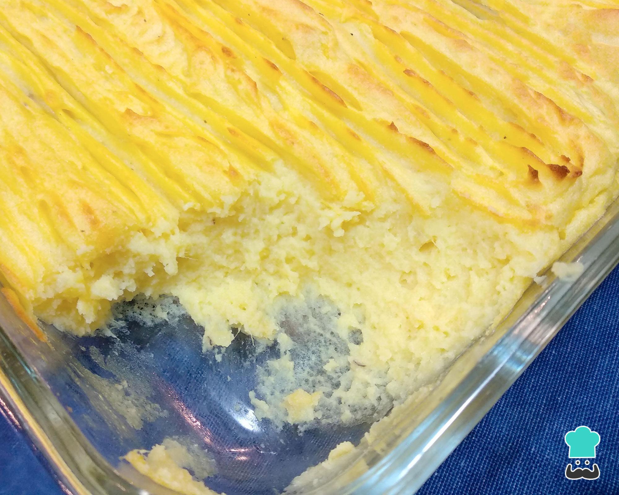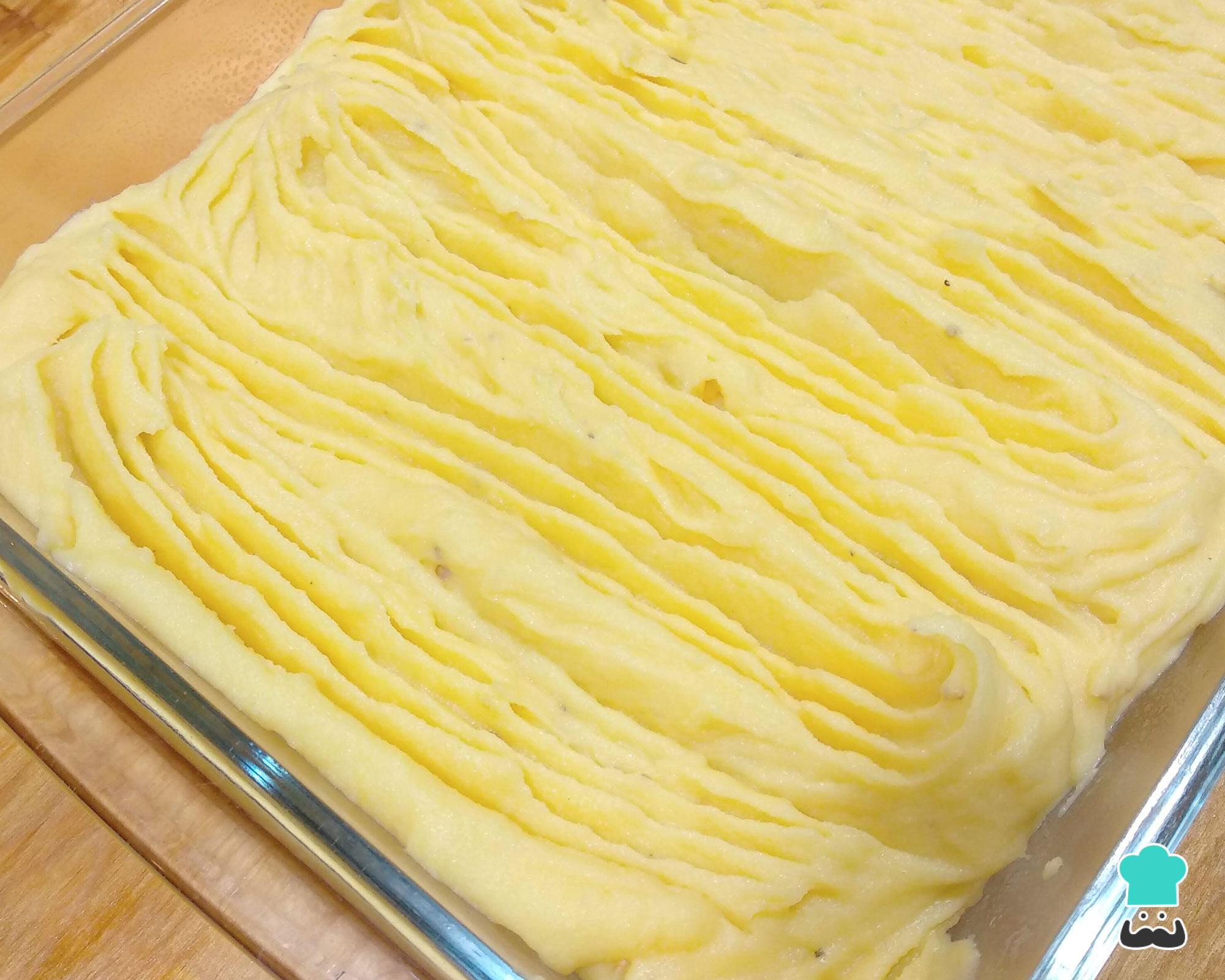 Coloque o purê de batata com gema de ovo e manteiga numa assadeira untada com óleo ou azeite. Faça alguns riscos com um garfo, para que o purê fique douradinho após assar, e leve ao forno nos 200ºC com calor em cima ou no modo grill por 10-15 minutos.