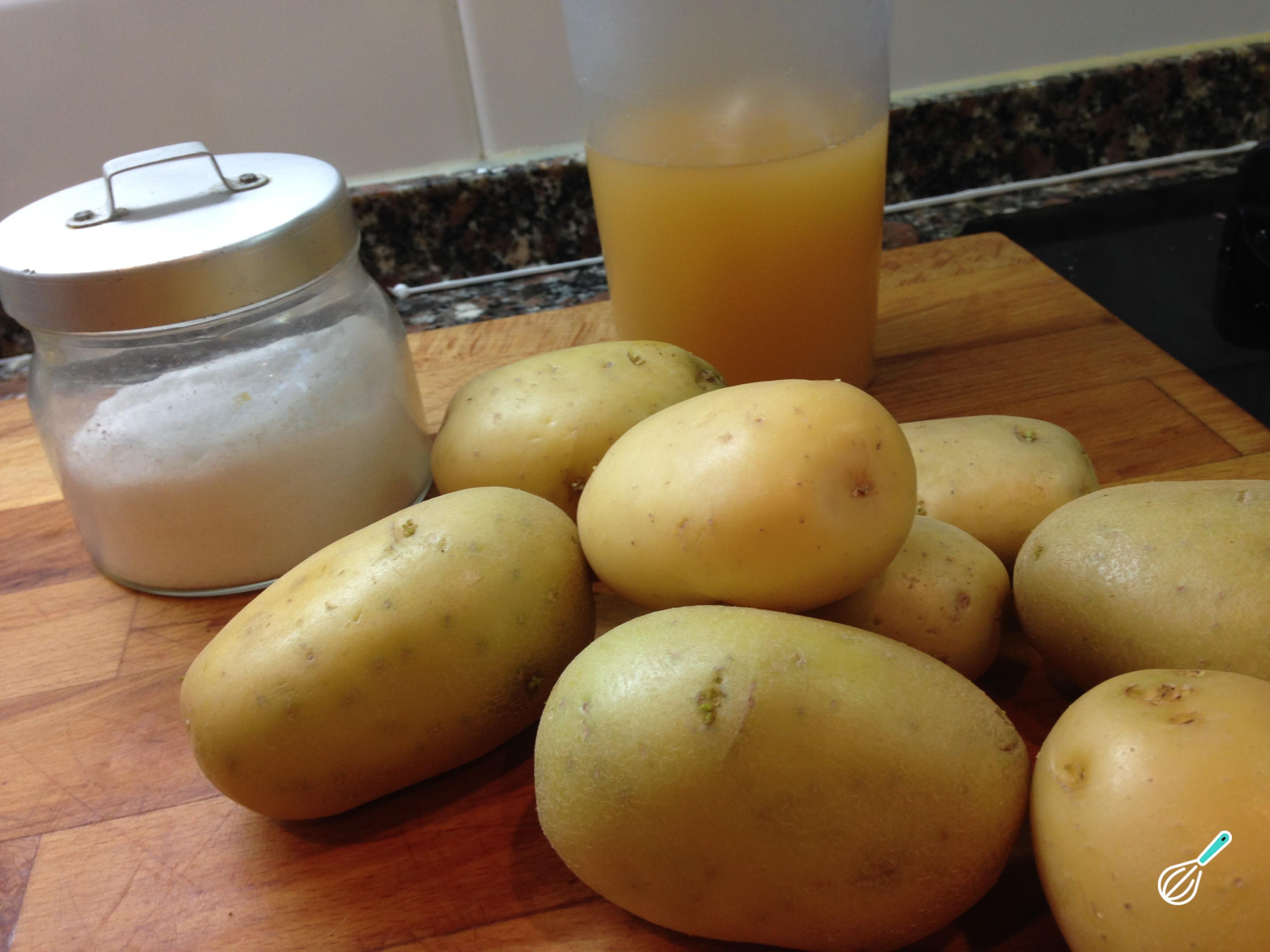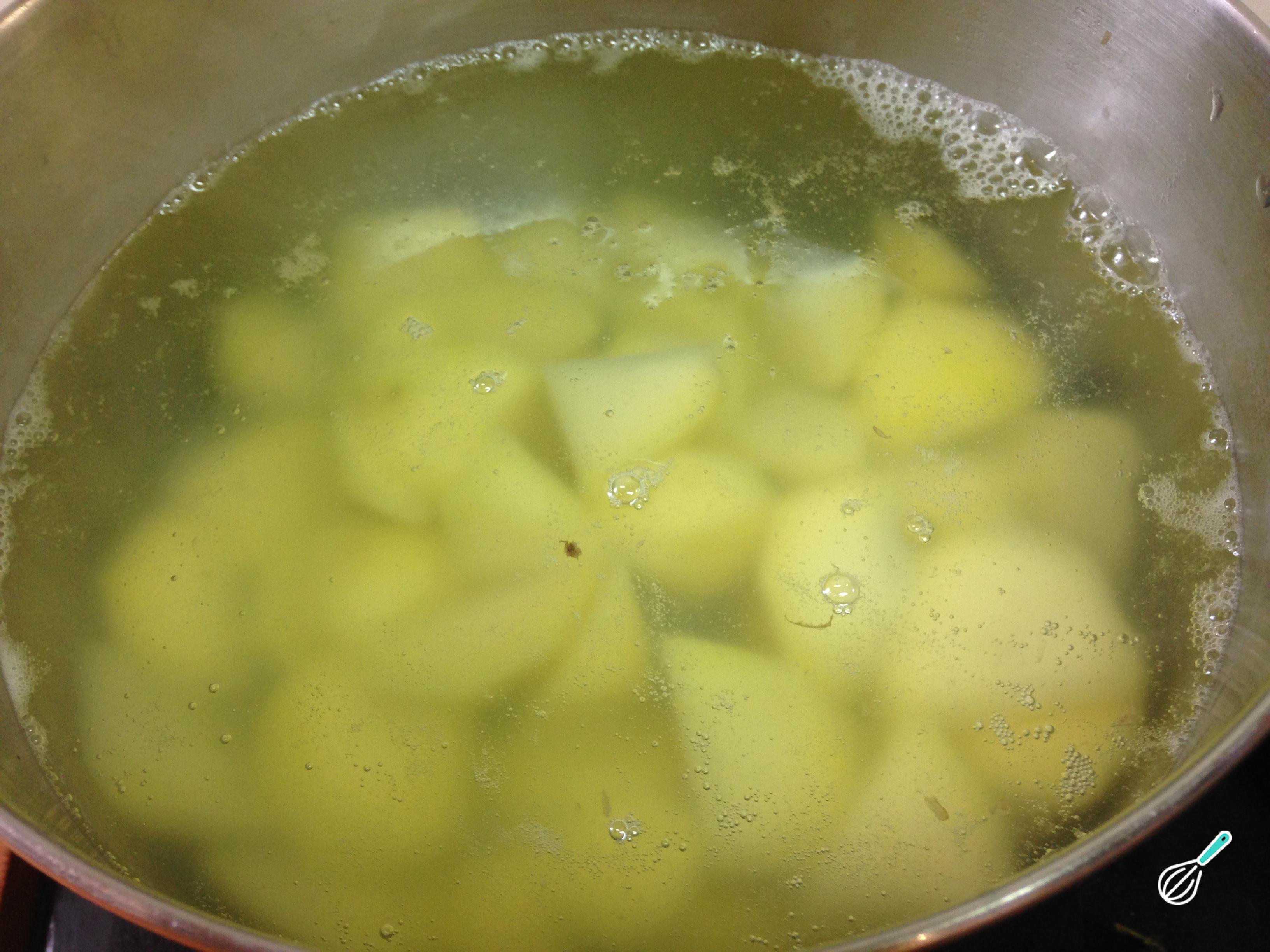 Lave e descasque as batatas e corte em pedaços. Leve a cozinhar numa panela com água abundante e um pouco de sal, durante 15-20 minutos, ou até que estejam bem macias.