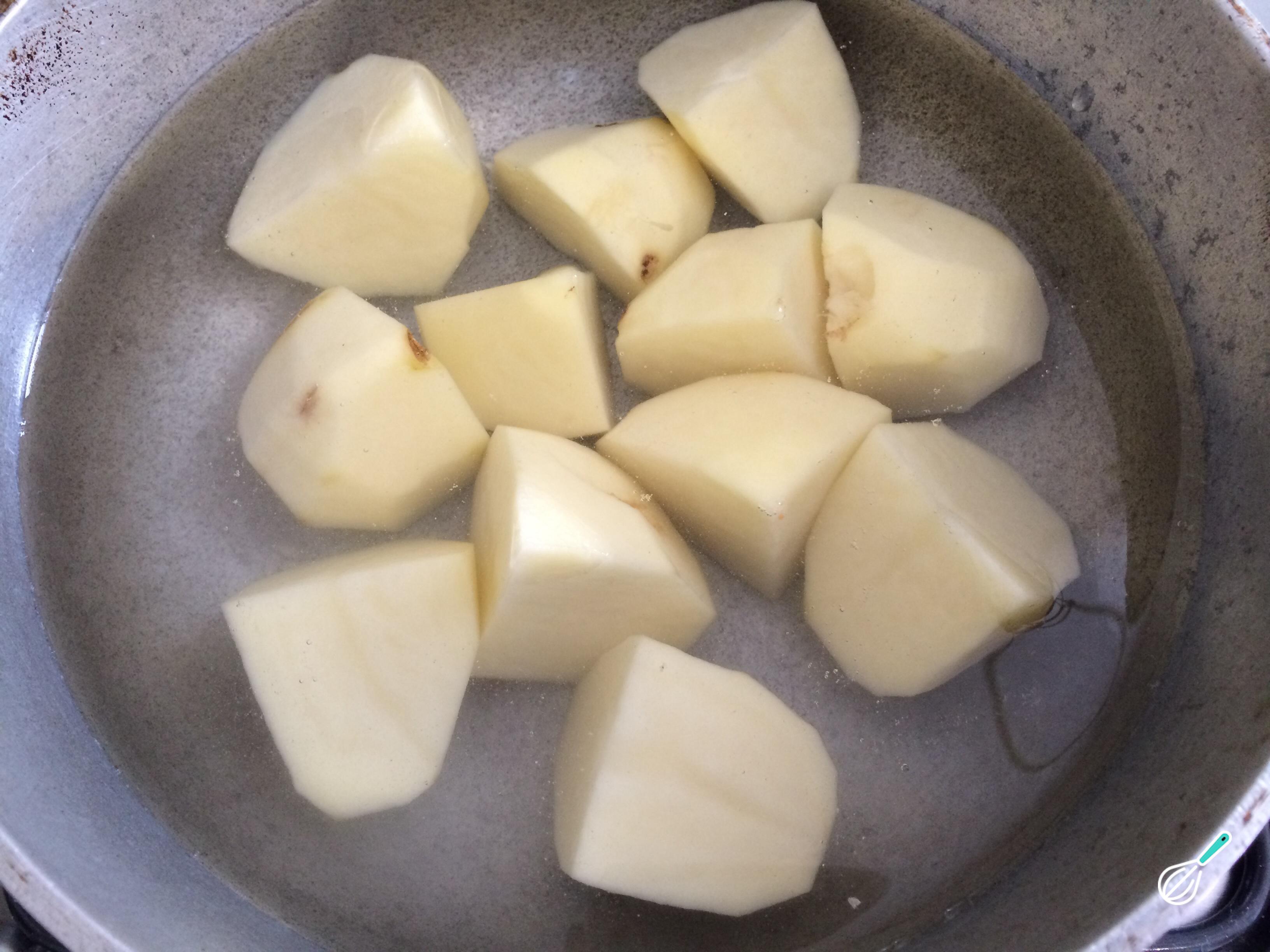 Em uma panela com água fria, adicione as batatas descascadas e cortadas em pedaços pequenos, cozinhe por 20 minutos em fogo alto até que estejam macias.