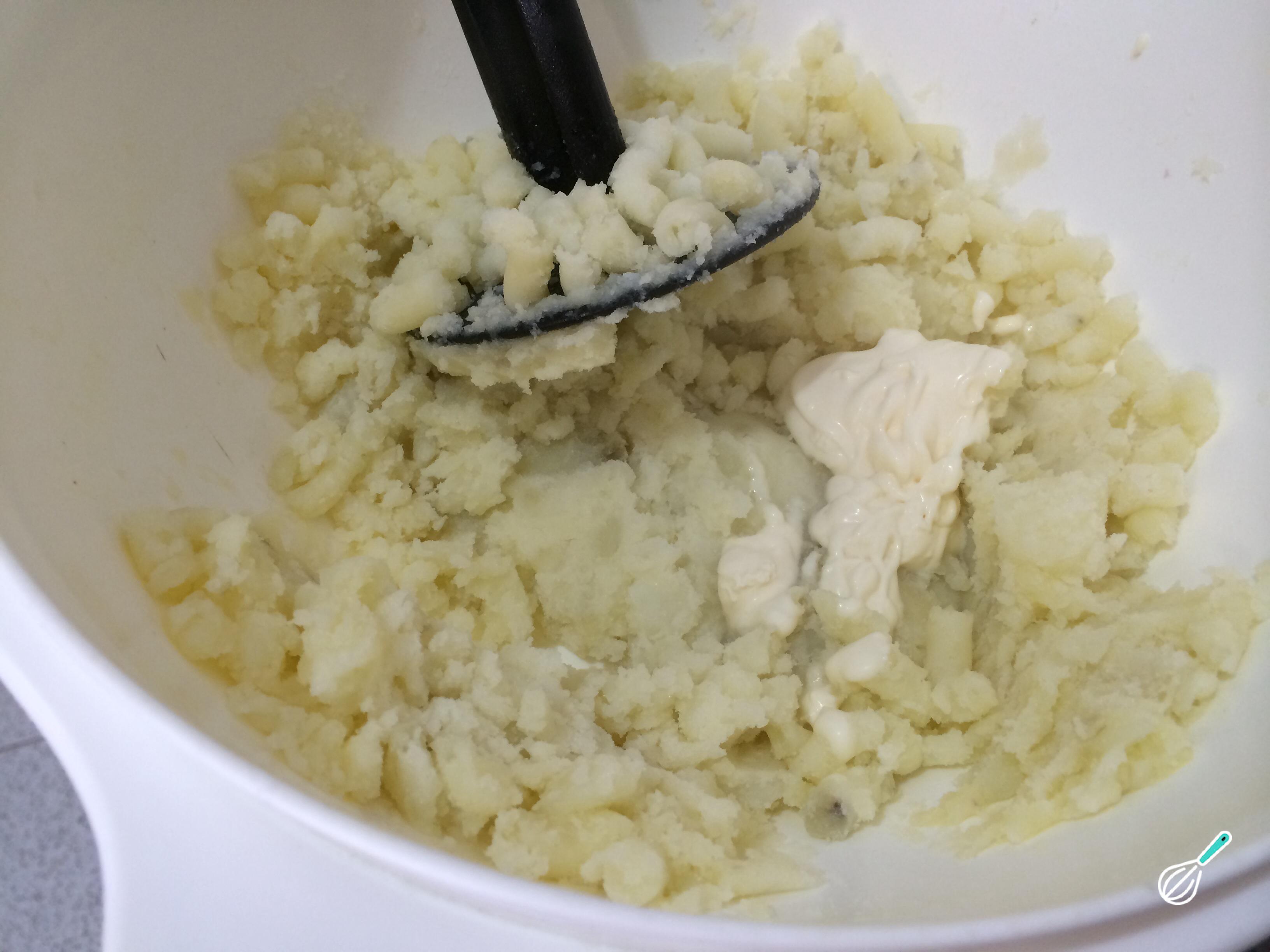Continuando com purê de batatas com cenoura, é hora de esmagar as batatas junto com a manteiga derretida e o creme de leite, para formar uma consistência macia e homogênea. Tempere com sal e pimenta.