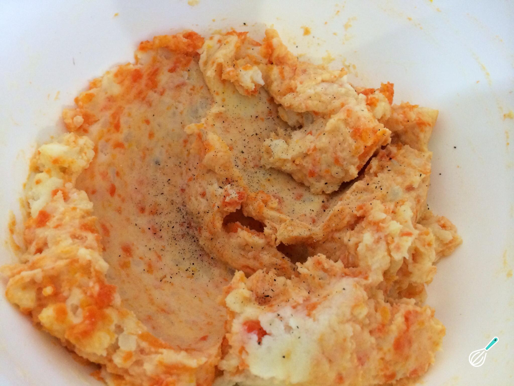 Para finalizar o purê de batatas com cenoura, misture muito bem os dois purês. Retifique o sabor com sal e pimenta.