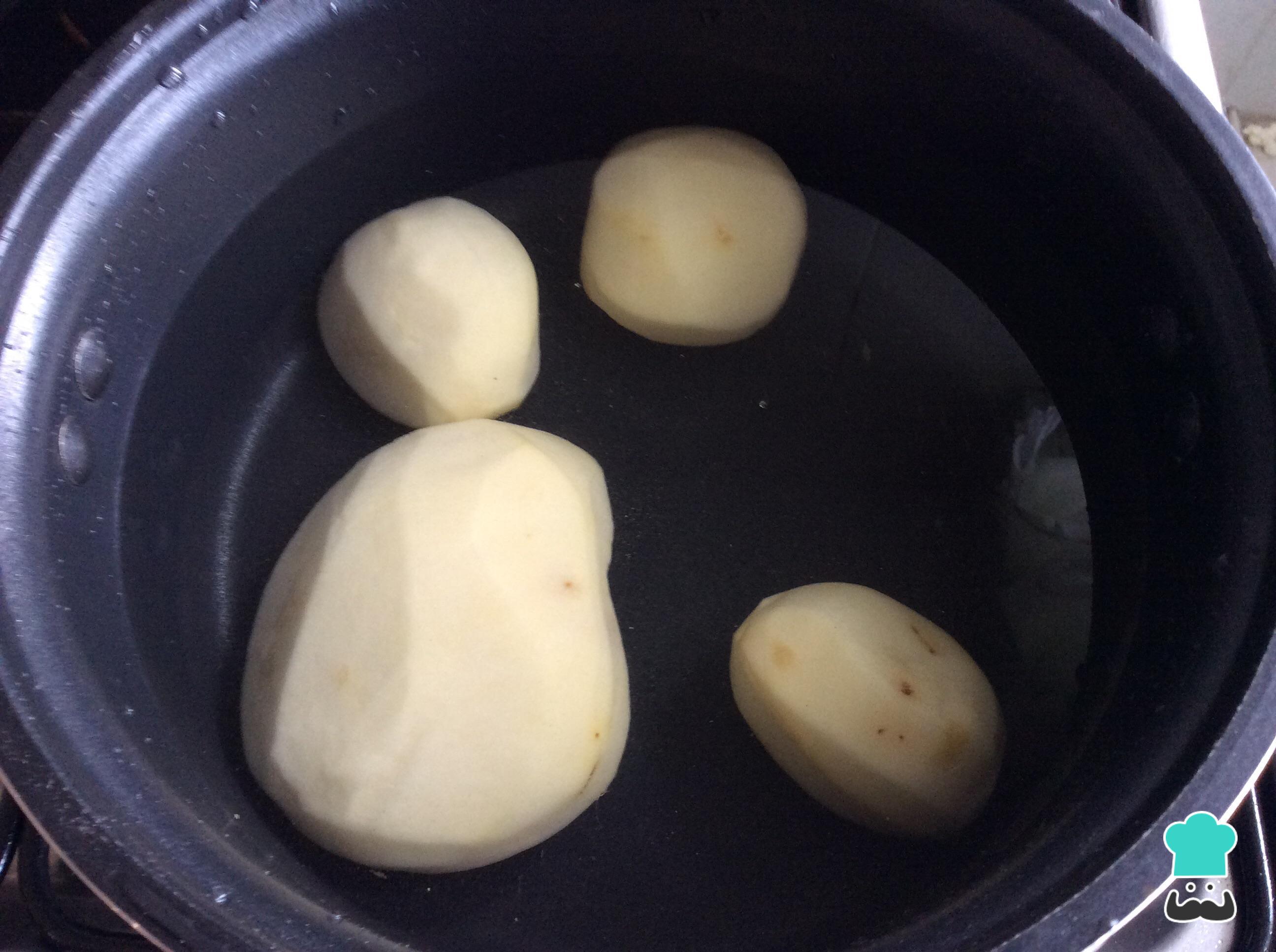 Descasque e lave as batatas. Coloque cozinhando em uma panela com água e um pouco de sal até que fiquem bem macias. Para acelerar o processo, corte as batatas em pedaços pequenos.