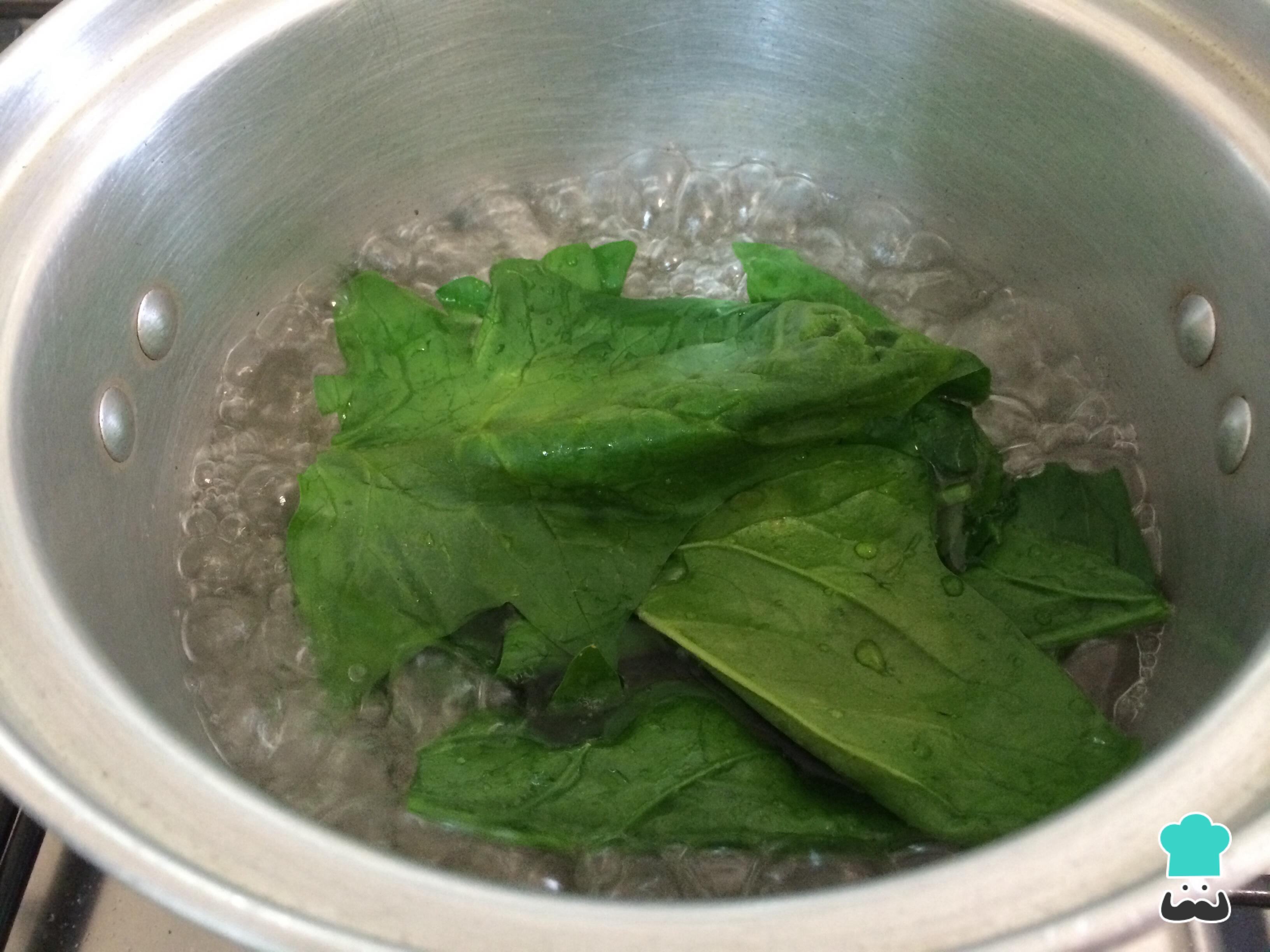 Lave as folhas de espinafre e coloque-as em uma panela com água fervente. Cozinhe por 5 minutos.