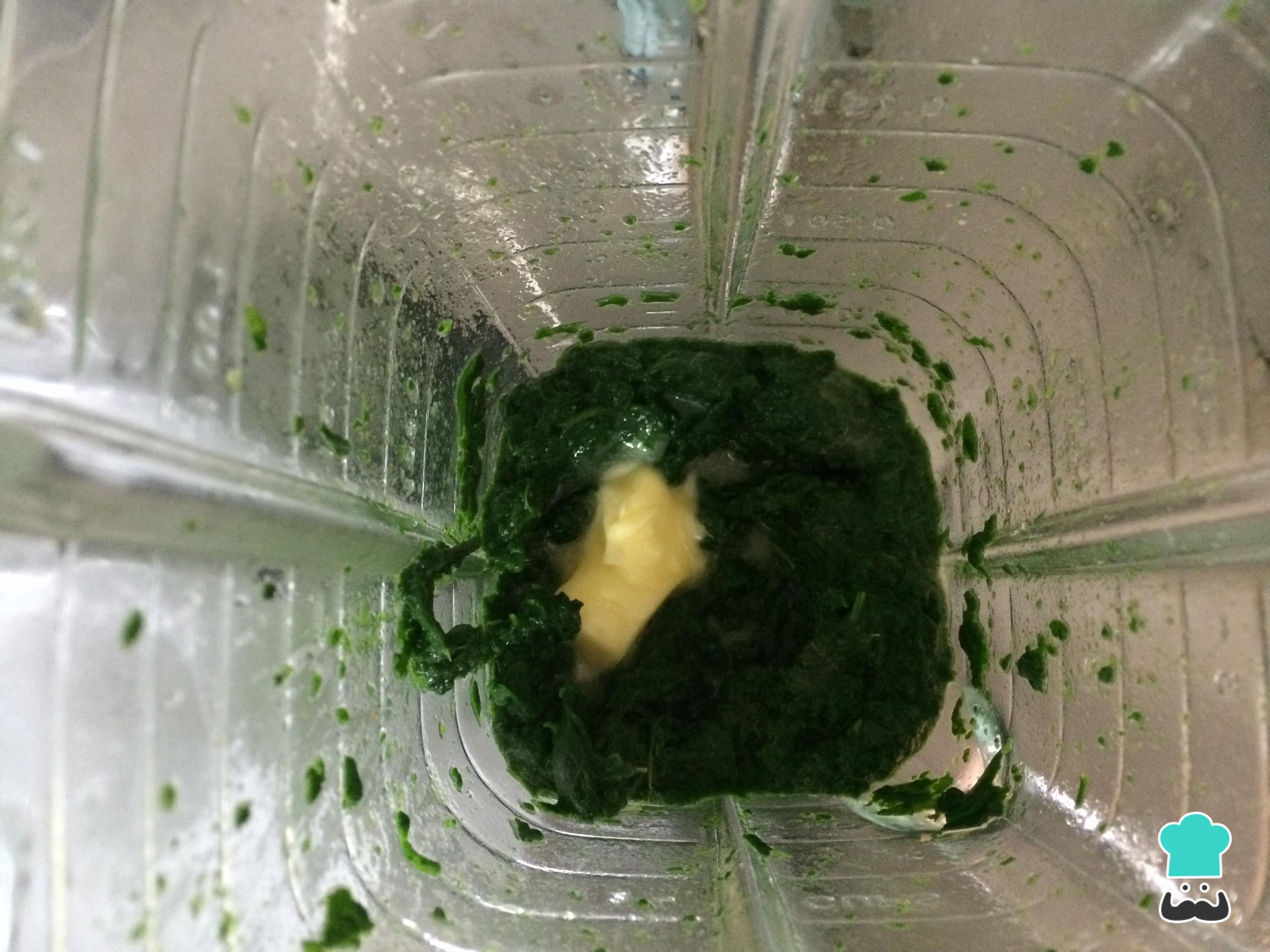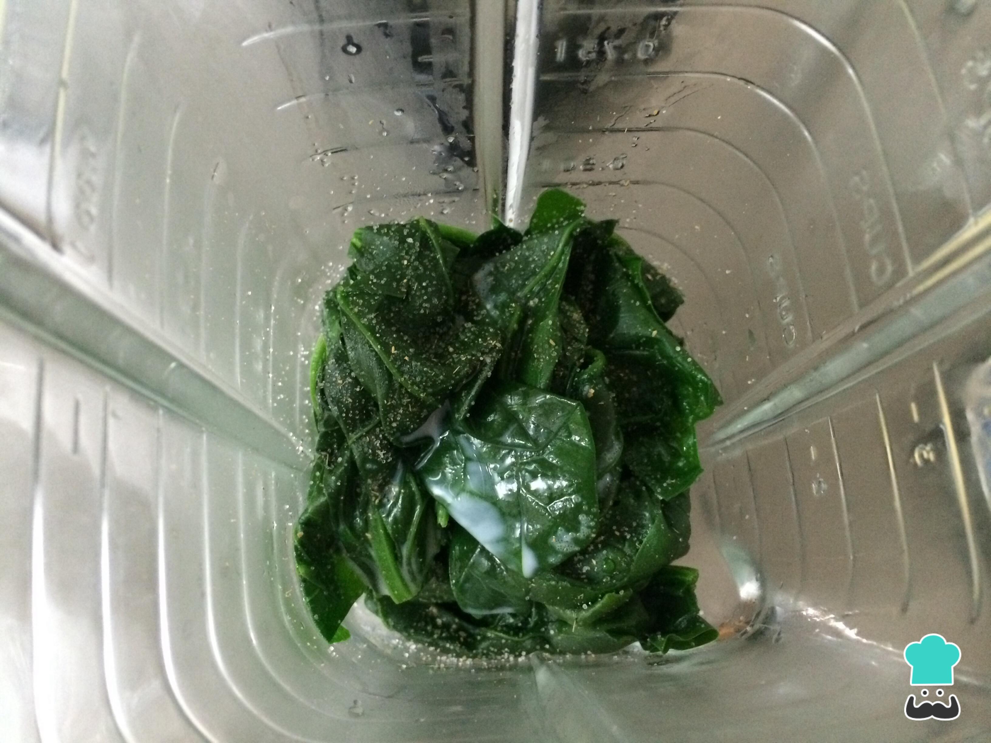 Após o passo anterior, continue preparando o purê de espinafre para bebês: bata as folhas de espinafre no liquidificador, junto com o leite, até obter uma pasta suave.