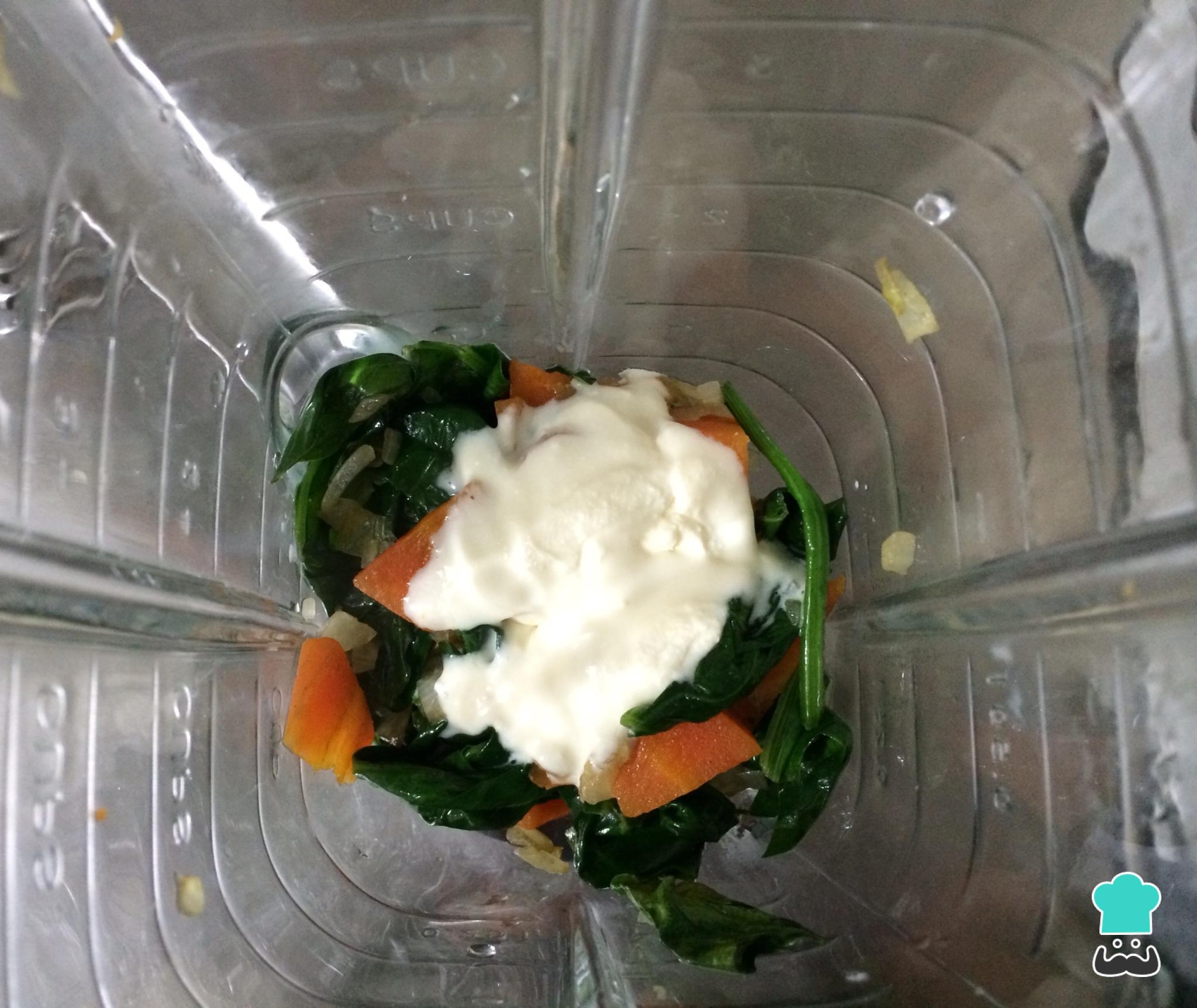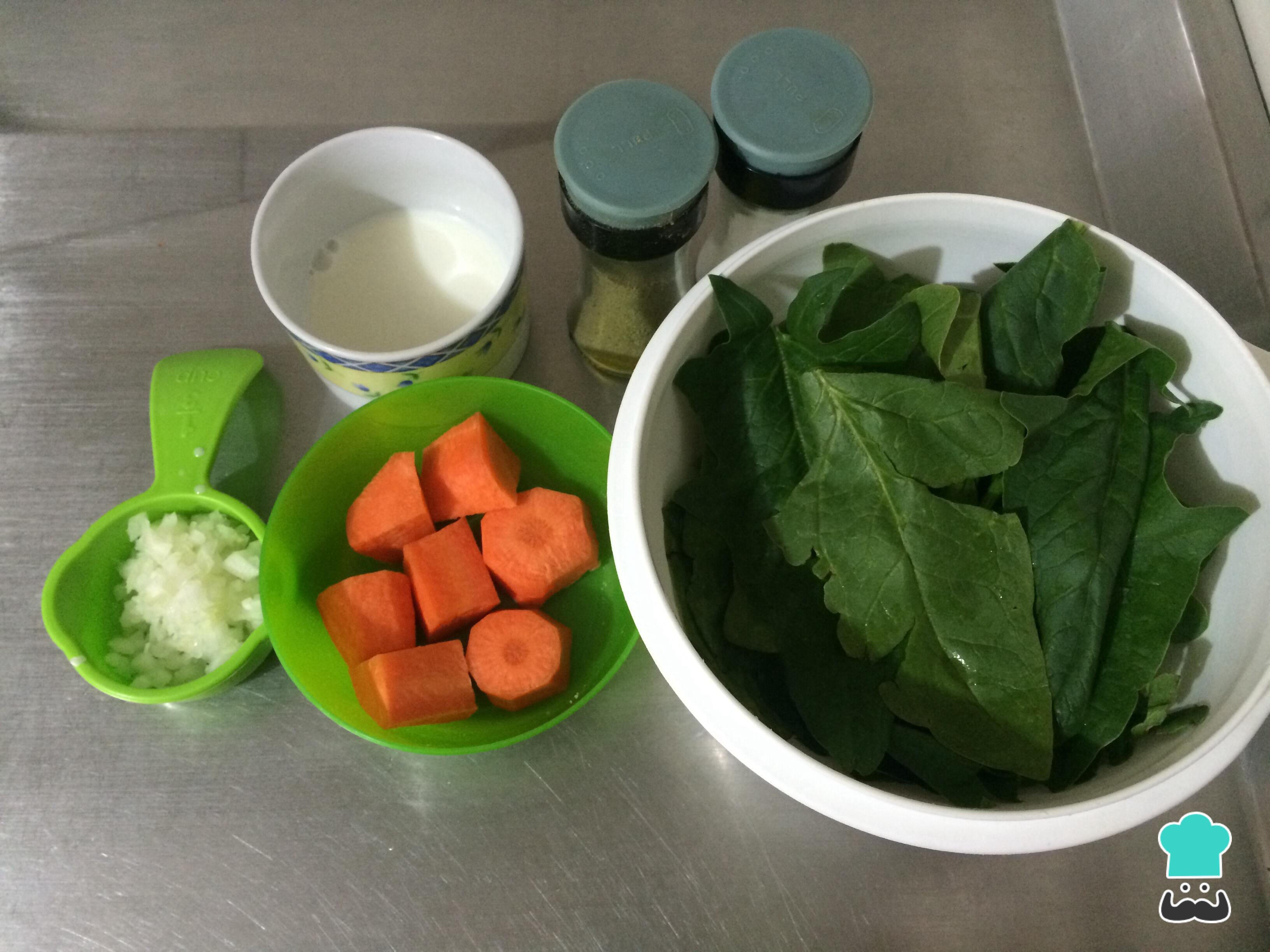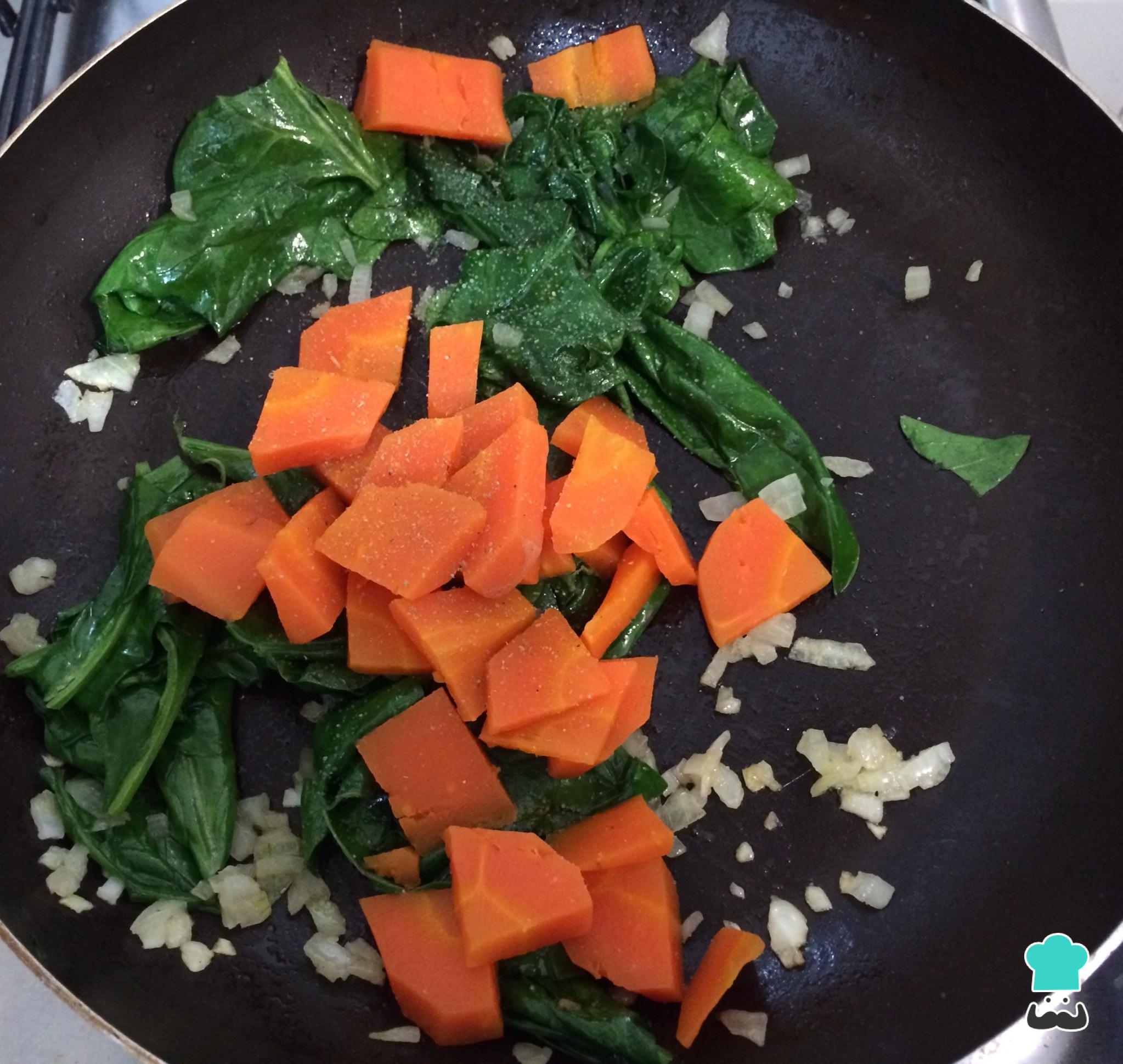 Após o passo anterior, junte a cenoura cortada em fatias pequenas, misture e tempere com sal e pimenta. Estes são os legumes que escolhemos usar neste purê de espinafres para crianças, porém você pode incluir outros do seu agrado.