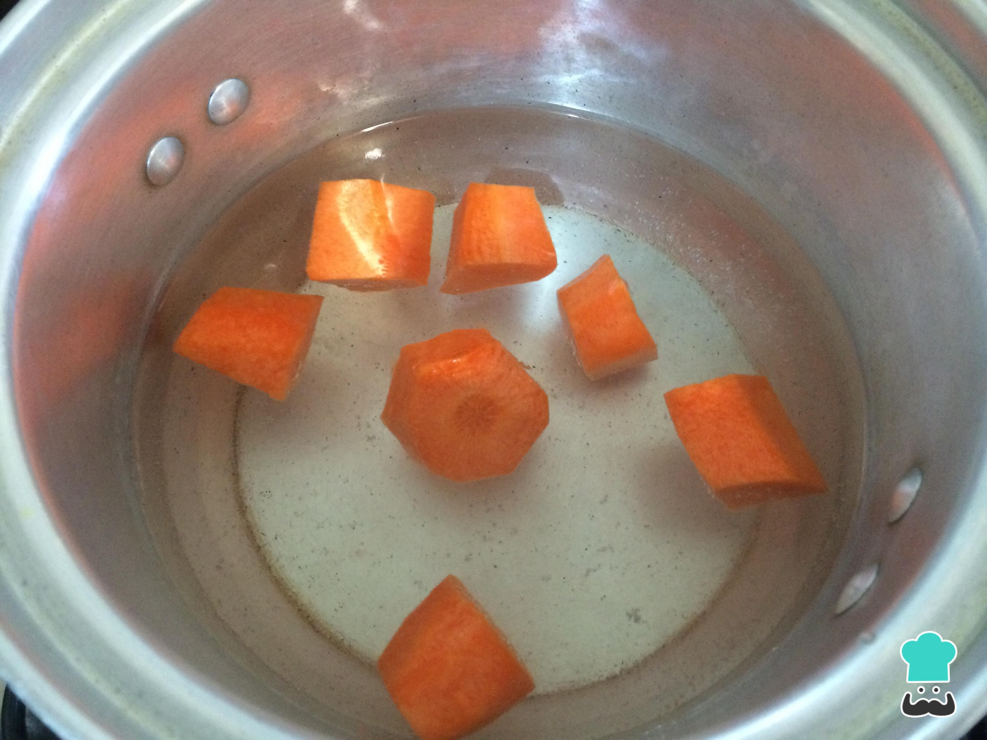 Em uma panela com água fervente, cozinhe a cenoura cortada em cubos pequenas, por 20 minutos ou até que esteja macia. Escorra e reserve.