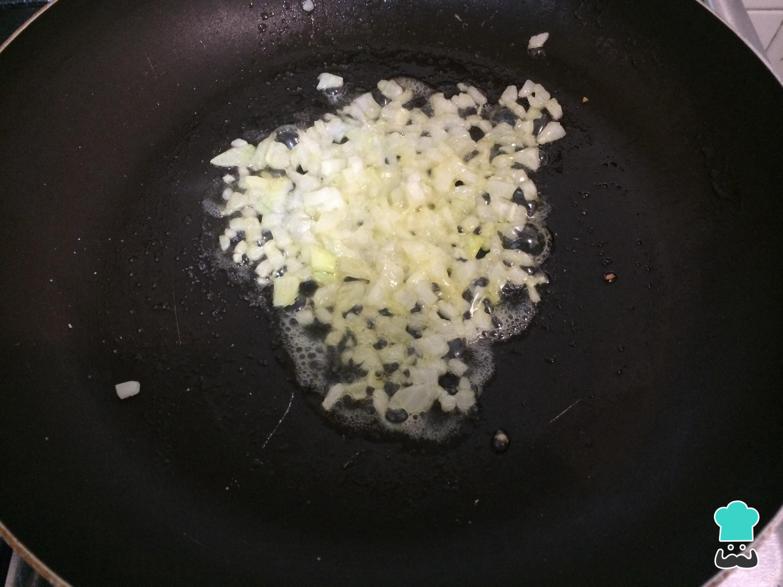 O passo seguinte desta receita de purê de espinafres colocar a manteiga derretendo em uma frigideira ao fogo médio. Adicione a cebola finamente picada e cozinhe até ficar macia.