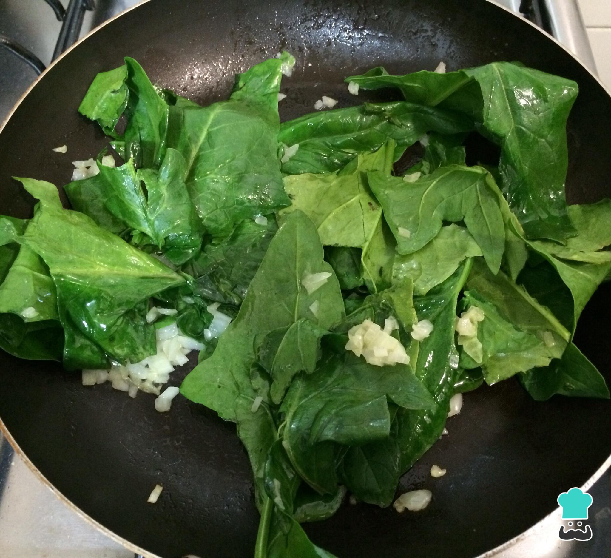 Acrescente à frigideira os espinafres lavados, e cozinhe até que reduzam de tamanho.
