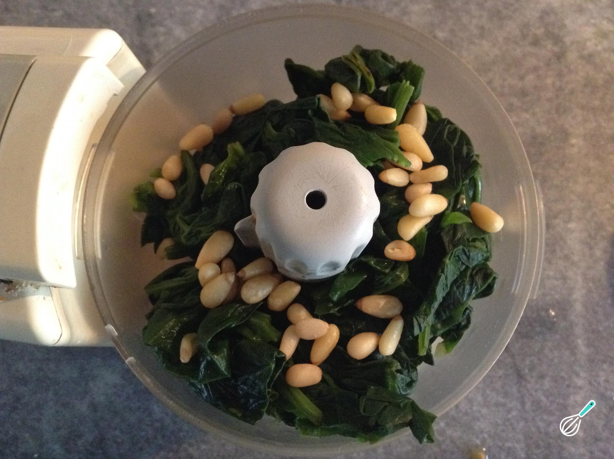 Coloque os espinafres e os pinhões no liquidificador ou em um processador de cozinha. Bata muito bem, para obter um purê.