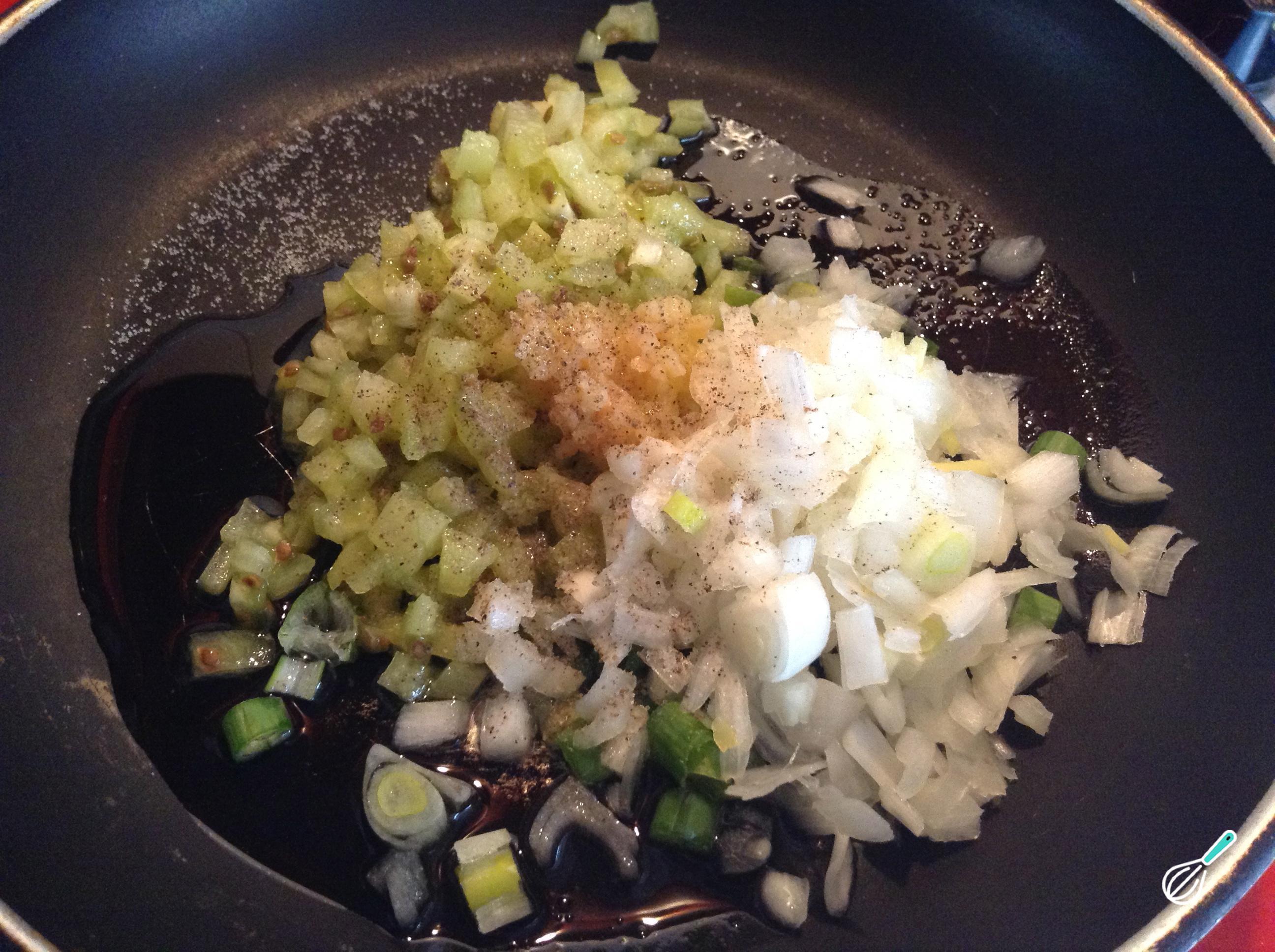 Corte os tomates em pedaços muito pequenos e, numa frigideira com óleo, coloque refogando junto com a cebola e a pasta de alho. Estes ingredientes irão conferir mais sabor a esta receita de purê de espinafre saudável!