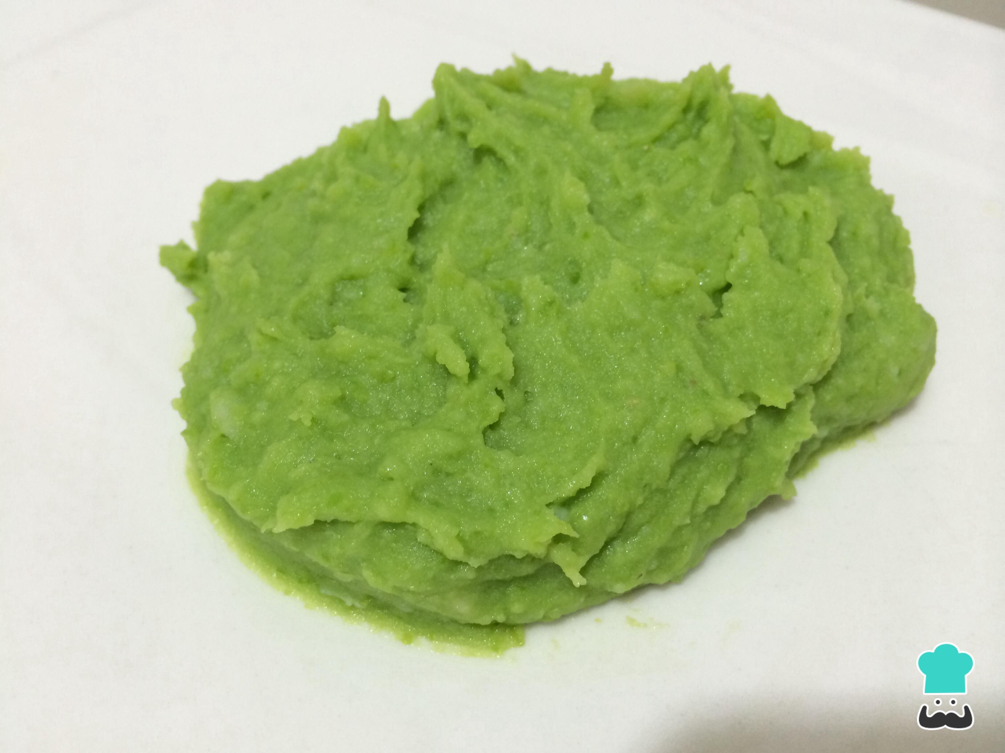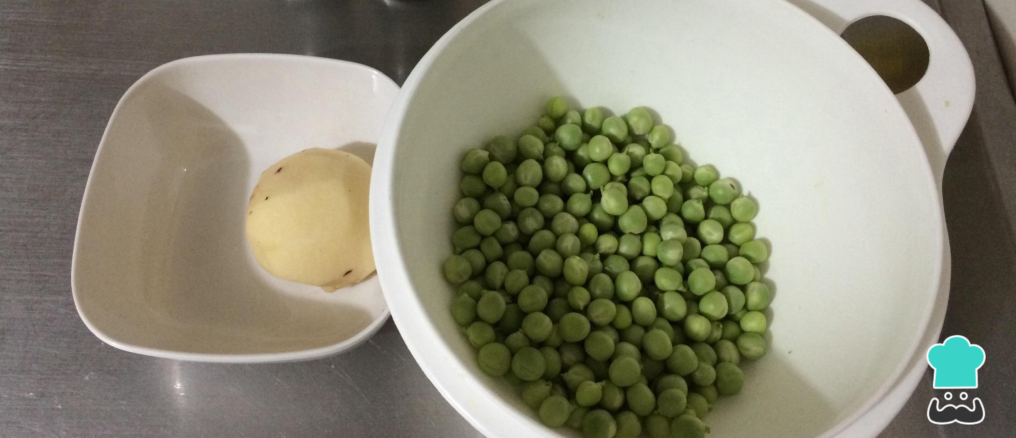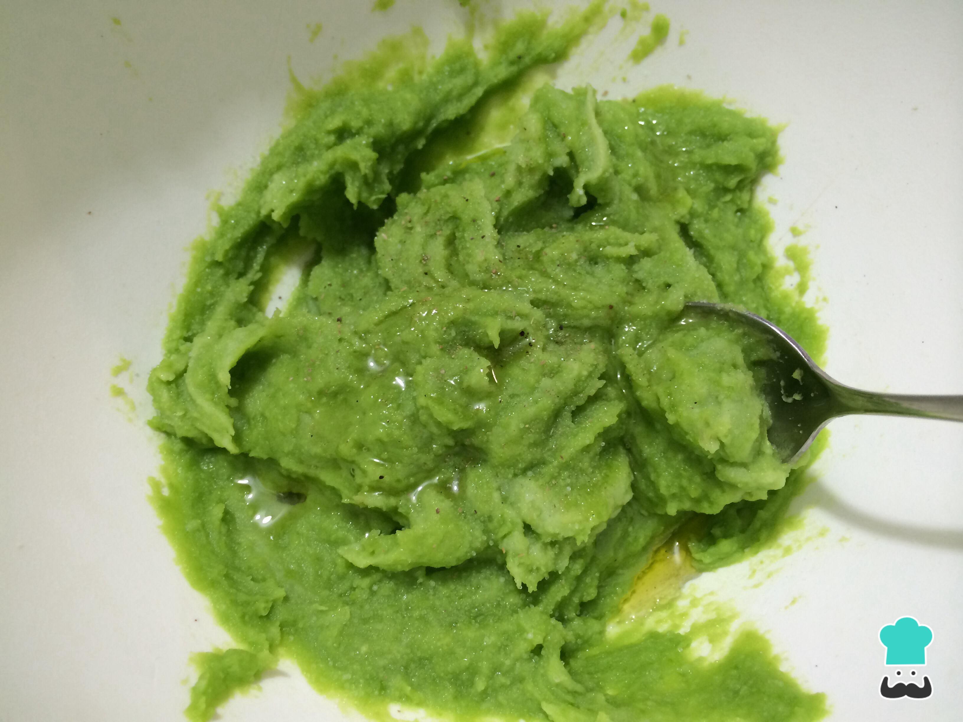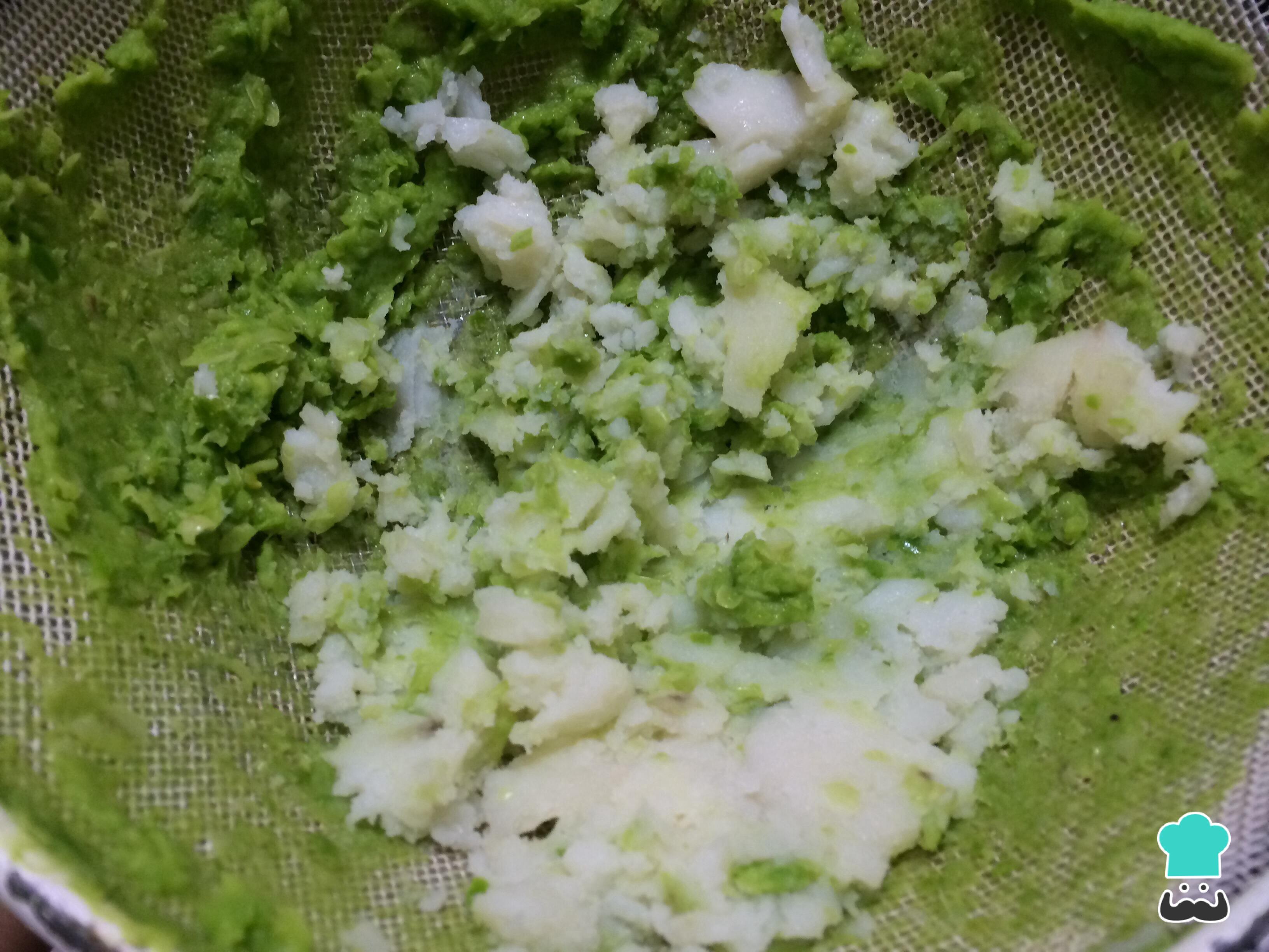 Esmague as batatas, misture-as com as ervilhas e passe ambos os ingredientes por um coador com uma rede não muito fina, de forma a obter um purê de textura fina e sem grumos.