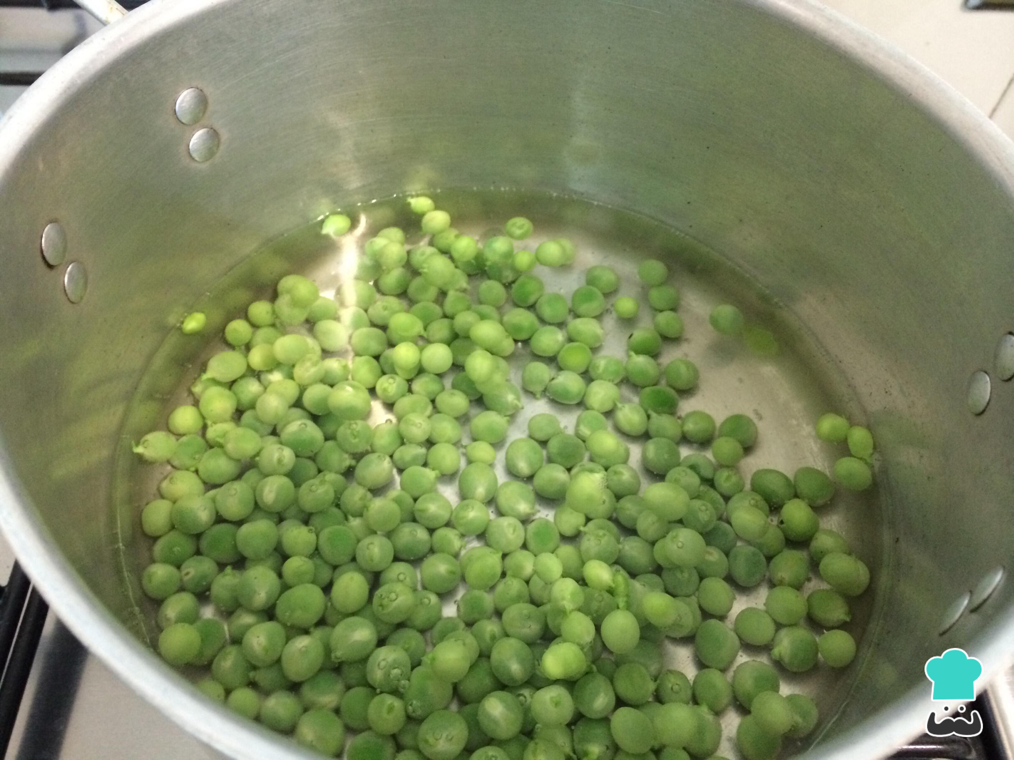 Em uma panela com água fervente e uma pitada de sal, adicione as ervilhas e cozinhe por 8 minutos, até que estejam macias.