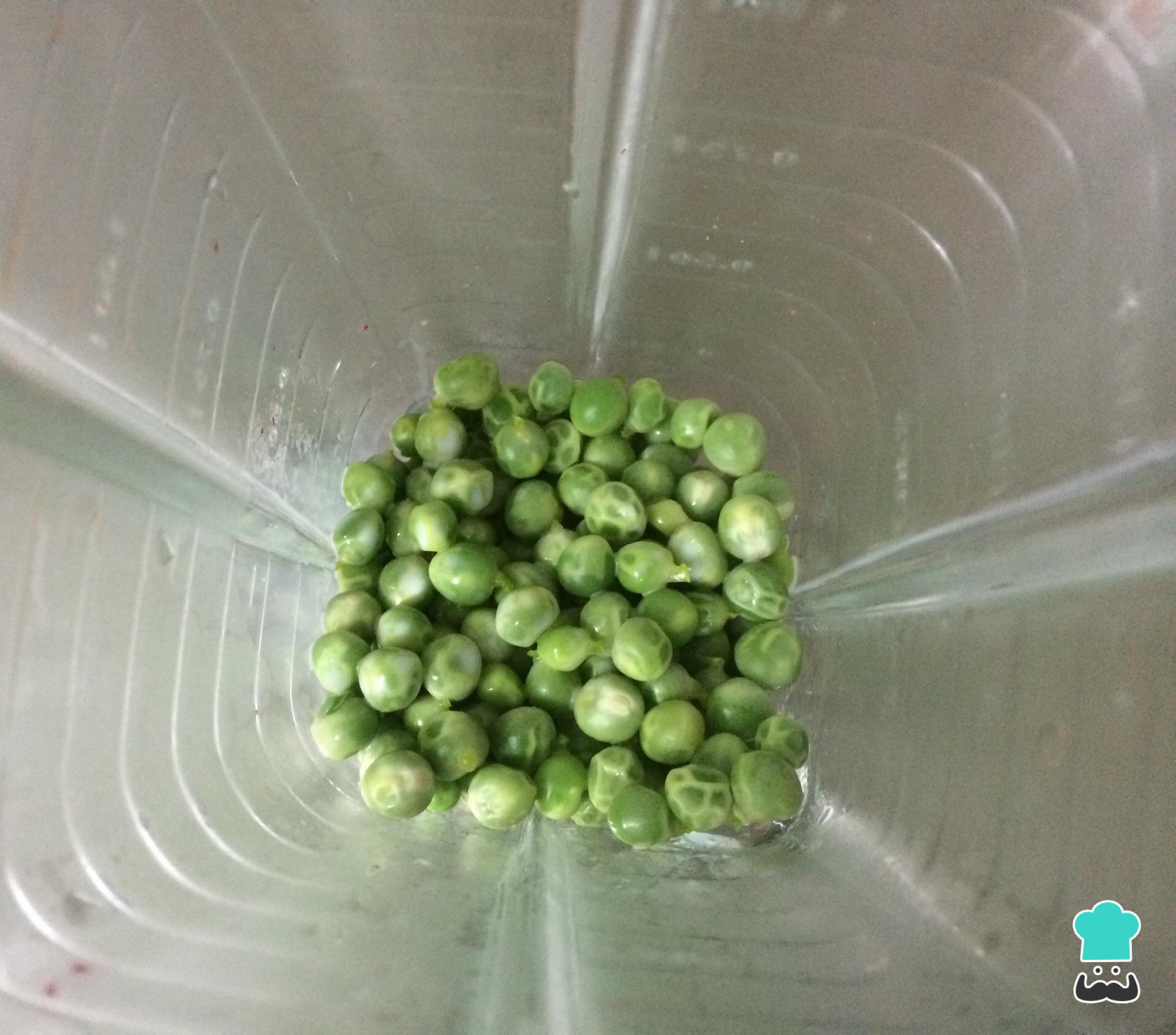 O passo seguinte deste purê de legumes para bebês é colocar as ervilhas cozidas e o leite no copo do liquidificador. Bata até obter uma pasta homogênea.