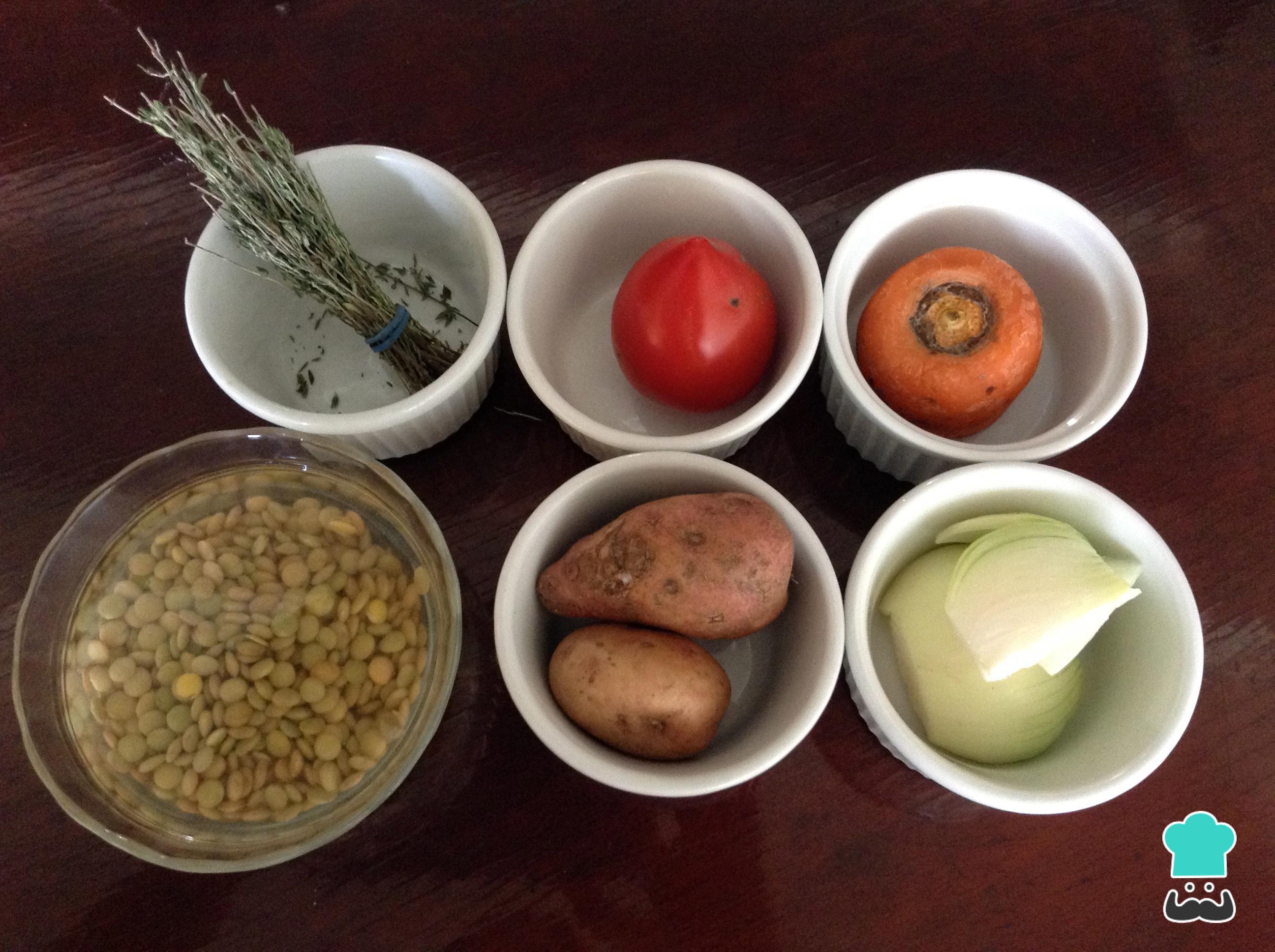 Para preparar este saboroso purê de lentilhas para bebês, comece por reunir os ingredientes. As quantidades indicadas servem 5 porções.