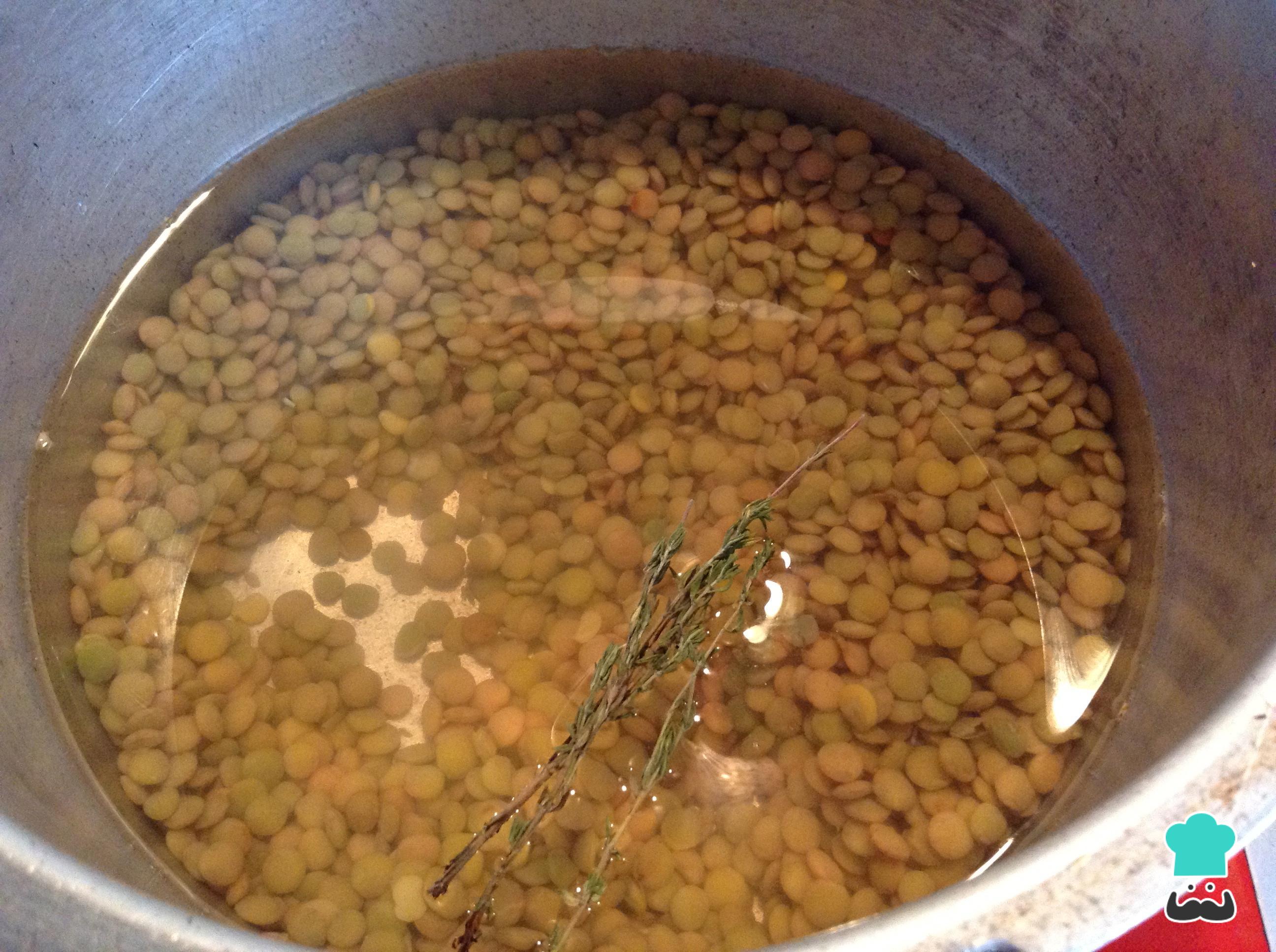 Coloque as lentilhas com água limpa numa panela de pressão, até que fiquem cobertas. Acrescente os ramos de tomilho, que darão sabor a estes grãos, e cozinhe por 15-20 minutos.