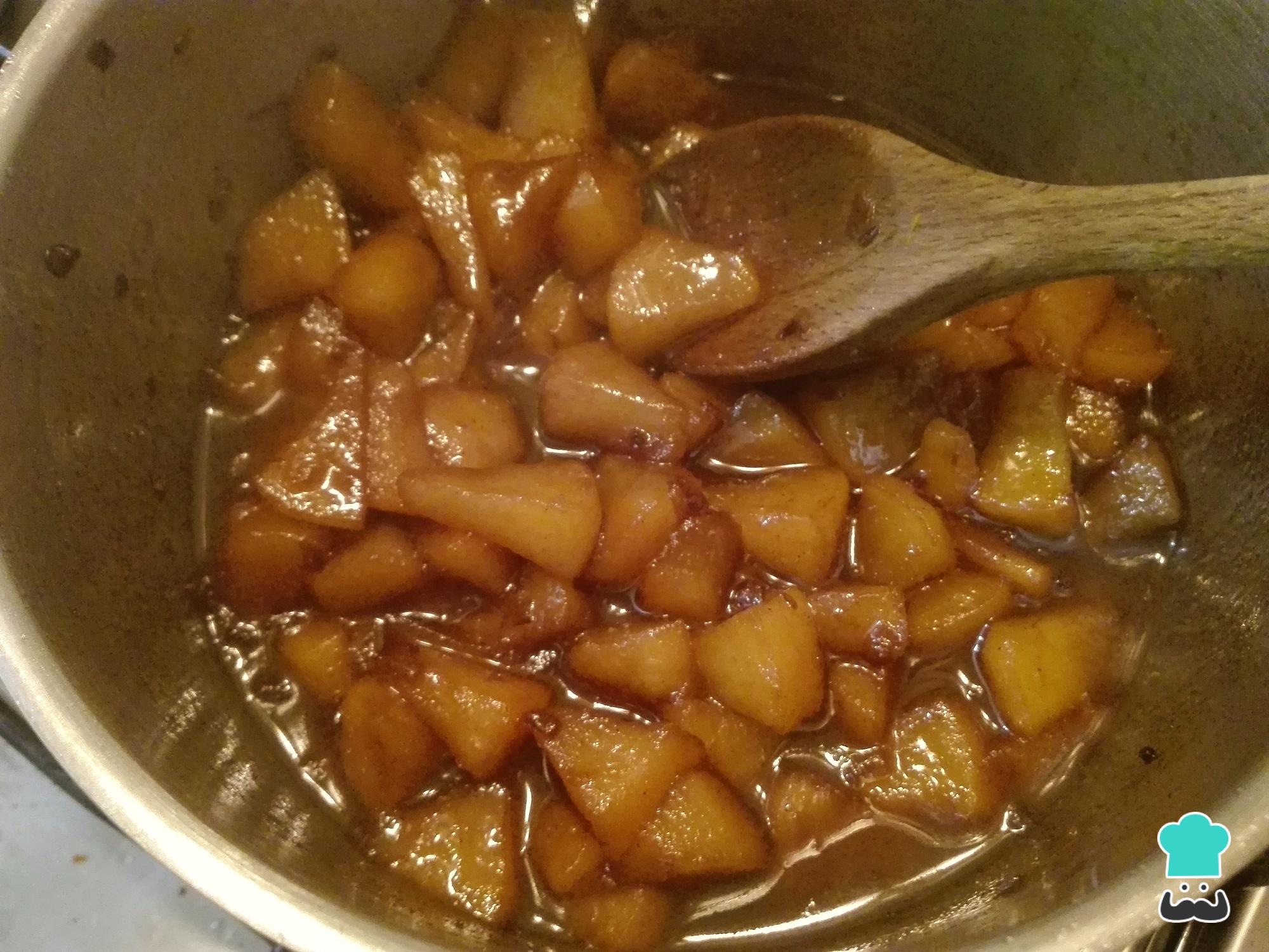 Coloque as maçãs numa panela junto com os restantes ingredientes, tampe e deixe cozinhar em fogo médio-baixo, como se estivessem preparando uma geleia de maçã.