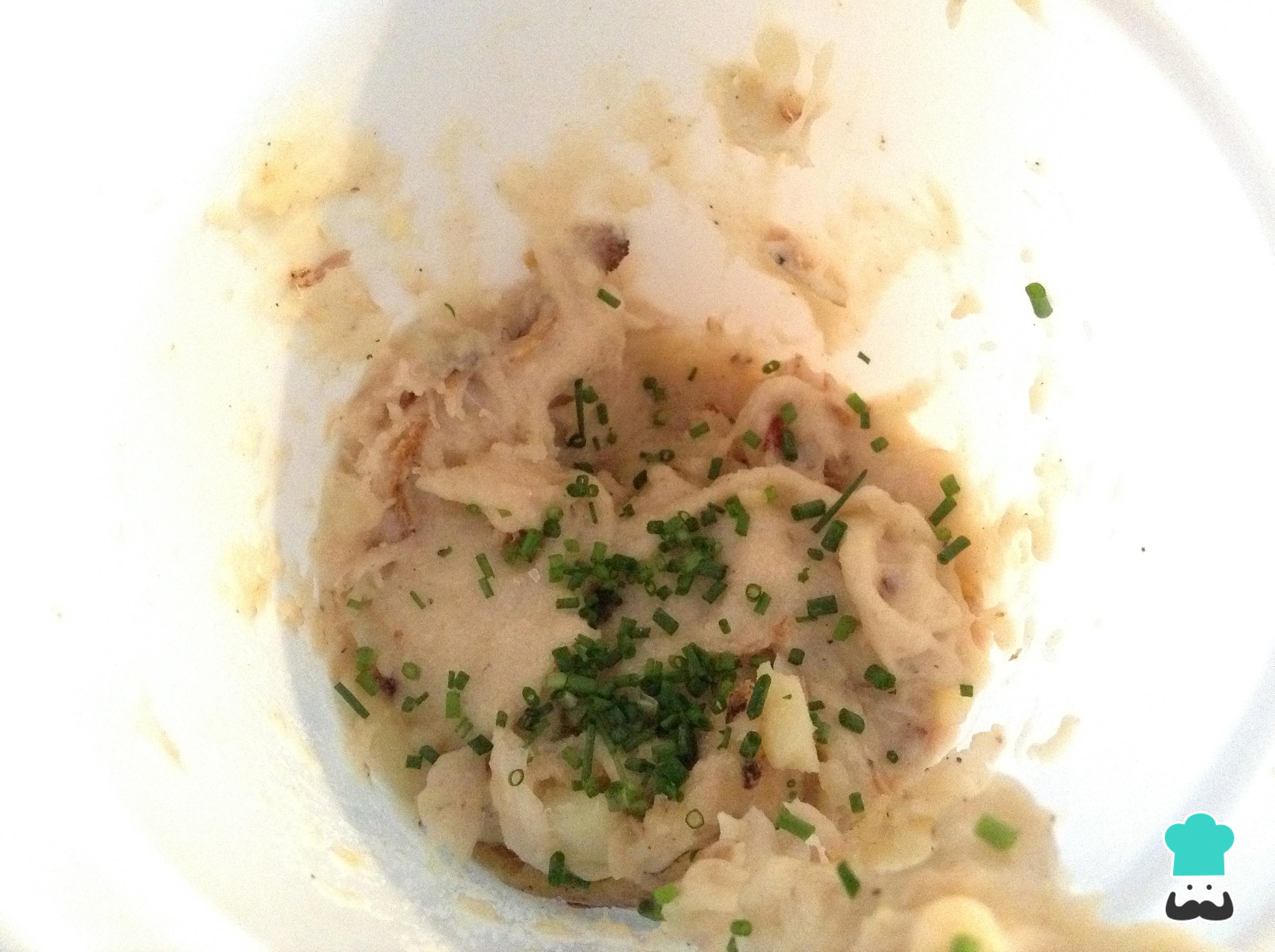 Assim que o peixe e as batatas estejam cozinhados, bata-os no liquidificador ou com um mixer, até obter um purê.