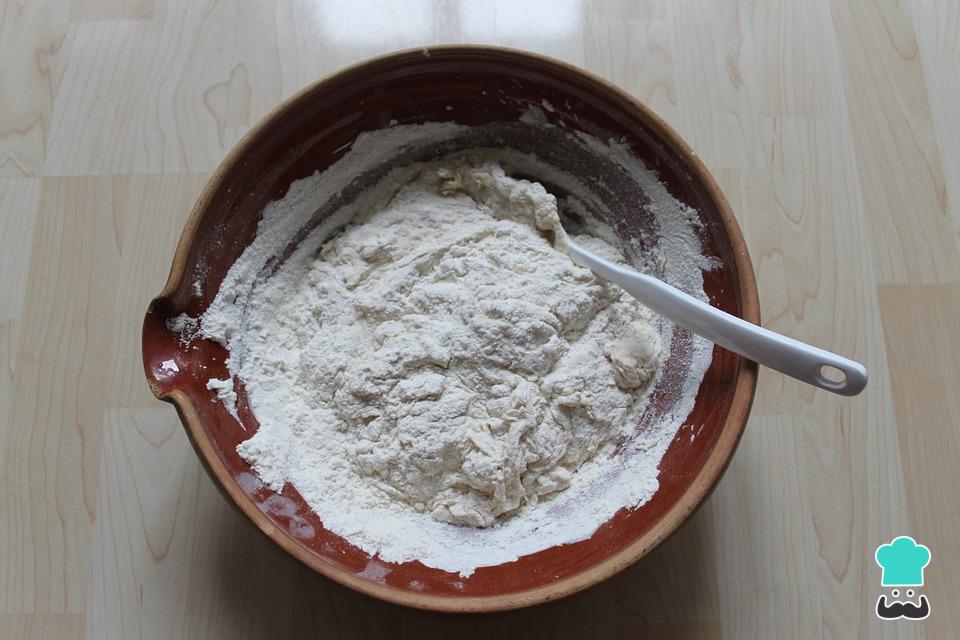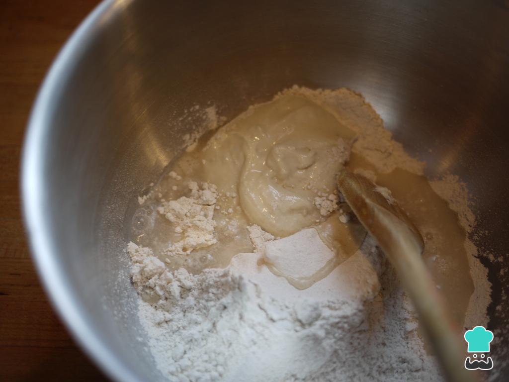 Para fazer o pão queca comece por misturar em uma tigela 1 xícara de farinha e meia xícara de açúcar. Dissolva o fermento no leite, adicione à tigela e misture bem até virar uma massa grudenta sem grumos. Cubra com um pano e deixe crescer por 1 hora.