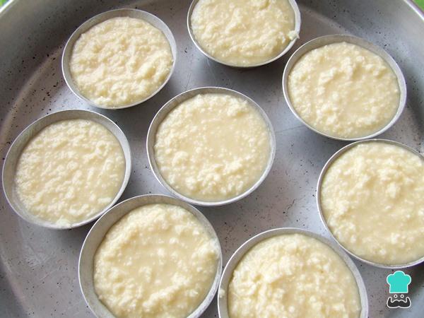 Para fazer queijadinha simples, comece por misturar todos os ingredientes em uma tigela até obter uma massa homogênea.