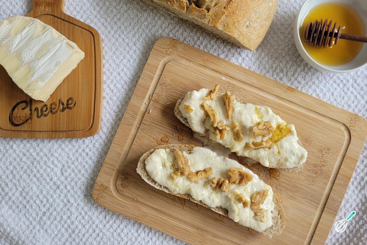 Depois de tostar as fatias de pão na frigideira com um pouco de azeite ou na frigideira, espalhe a pastinha de brie por cima. Espalhe o mel e as nozes picadas.