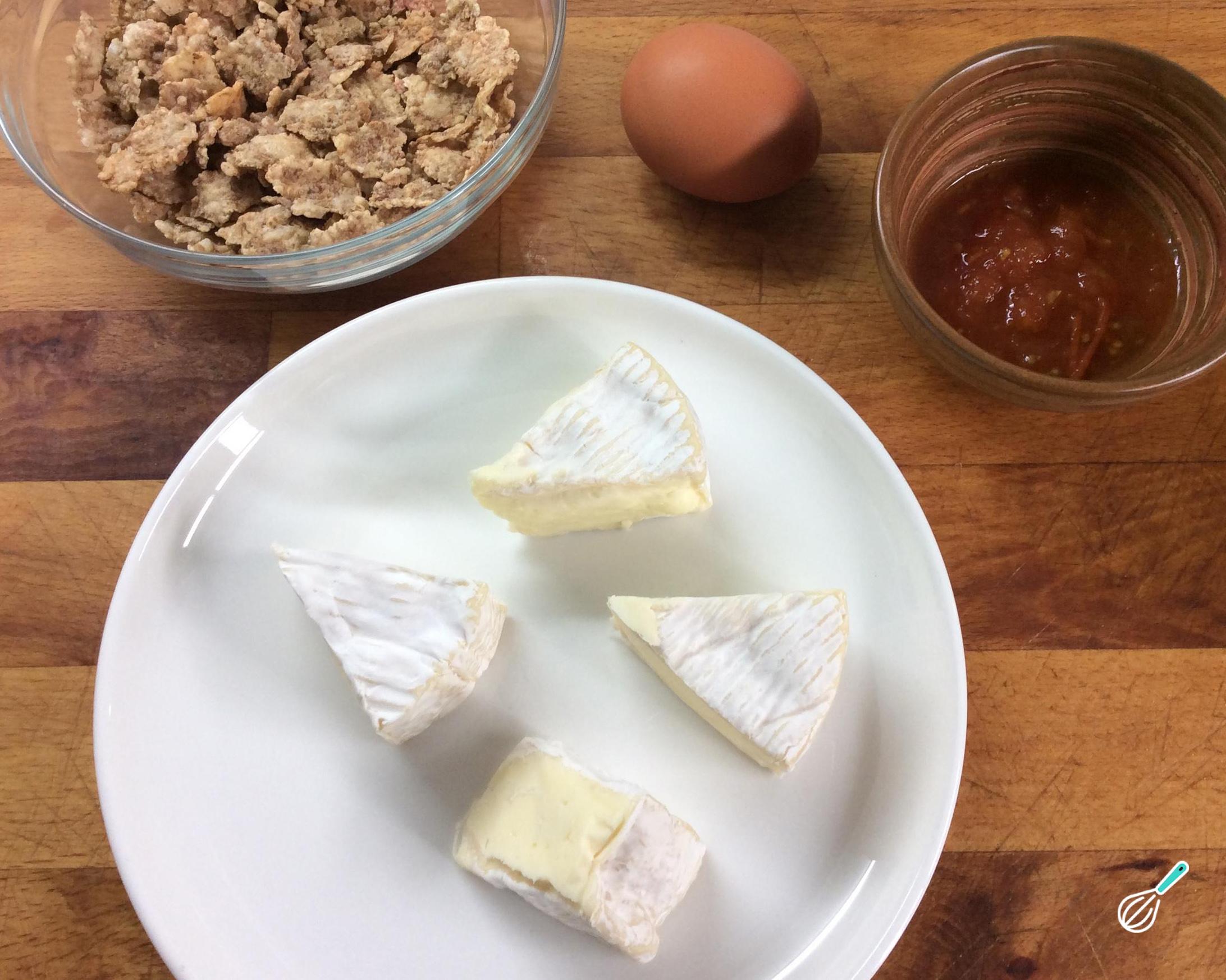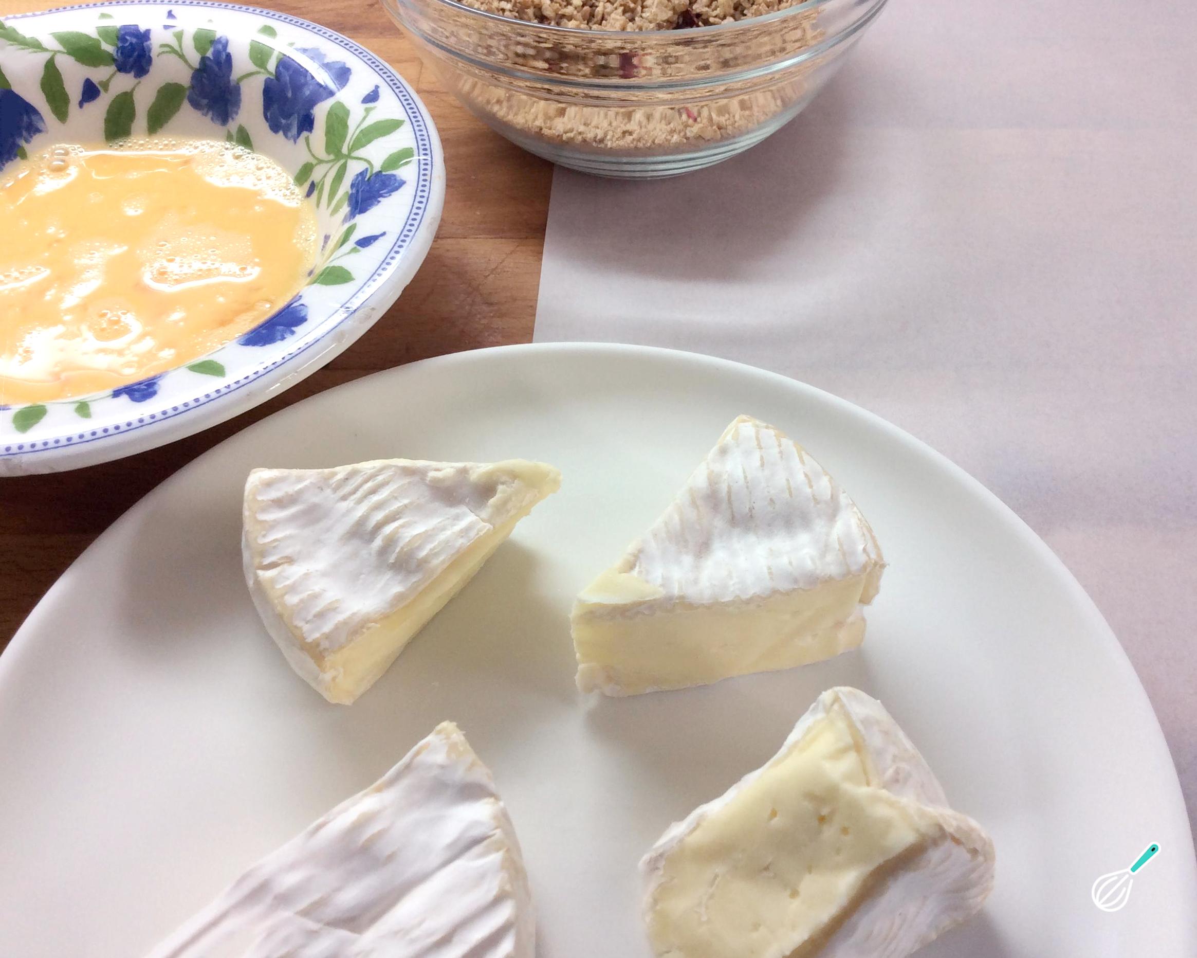 Reúna os ingredientes necessários ao preparo desta receita de queijo camembert crocante. Se preferir, pode empanar o queijo com farinha de rosca ou panko, porém os flocos de cereais são uma opção menos calórica. O queijo, por uma vez, pode ser empanado inteiro ou cortado em pedaços.