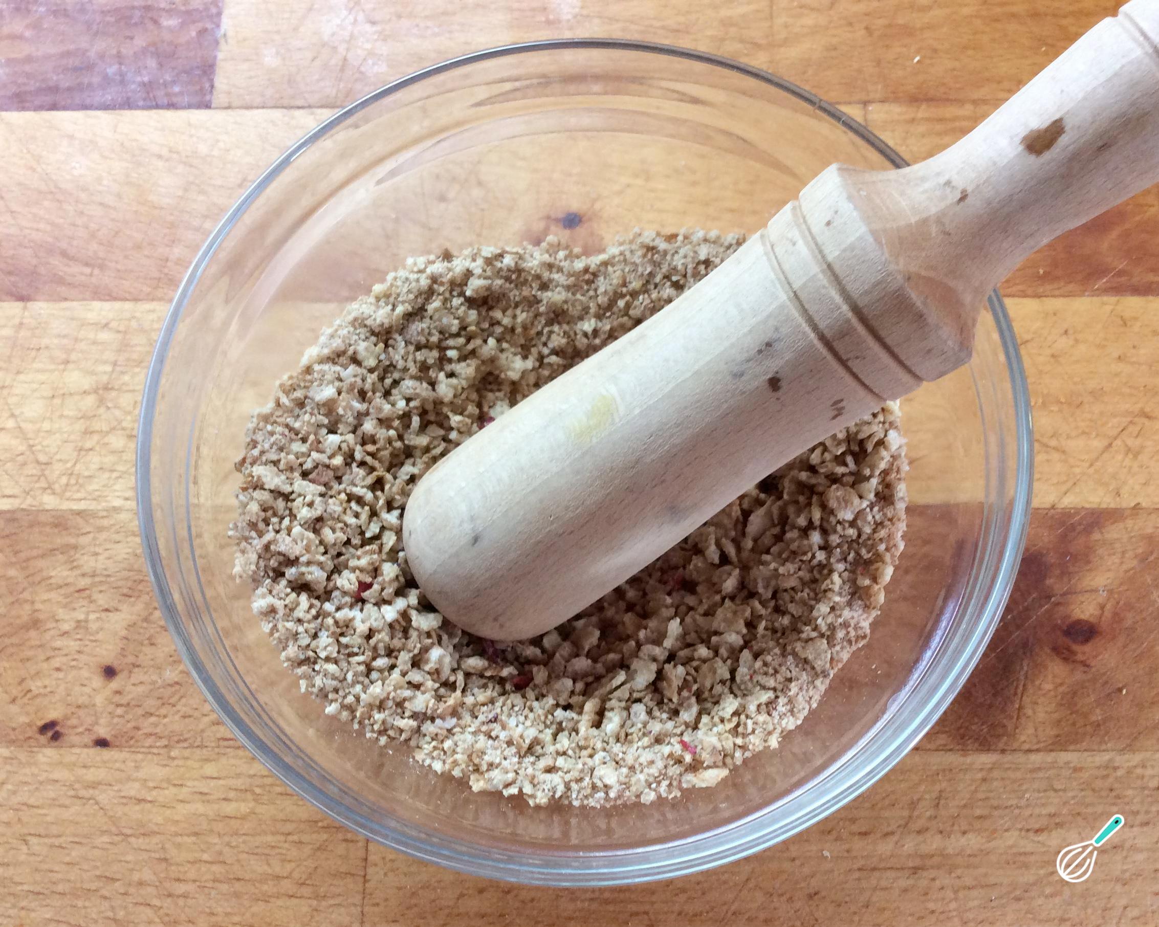 Esmague os flocos de cereais com um socador ou triture num processador de cozinha. De acordo com a sua preferência, pode esmagar os flocos até obter uma textura mais ou menos fina.